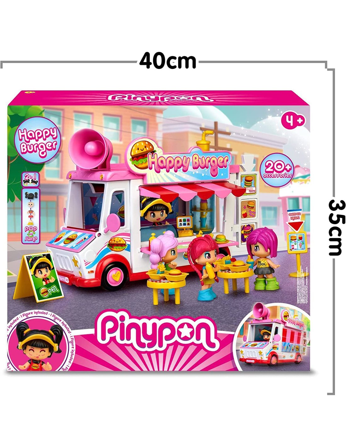 Pinypon Happy Burger ha numerosi dettagli, come un vero ristorante; Scegli quello che vuoi dal menù girevole, effettua il tuo ordine online e scegli un dolce al bancone; Ci sono tavoli per mangiare, un registratore di cassa e tutti i piccoli accessori; All'interno ci sono 3 cassetti e un vano per riporre tutti i 30 accessori. Include la figura della cameriera;