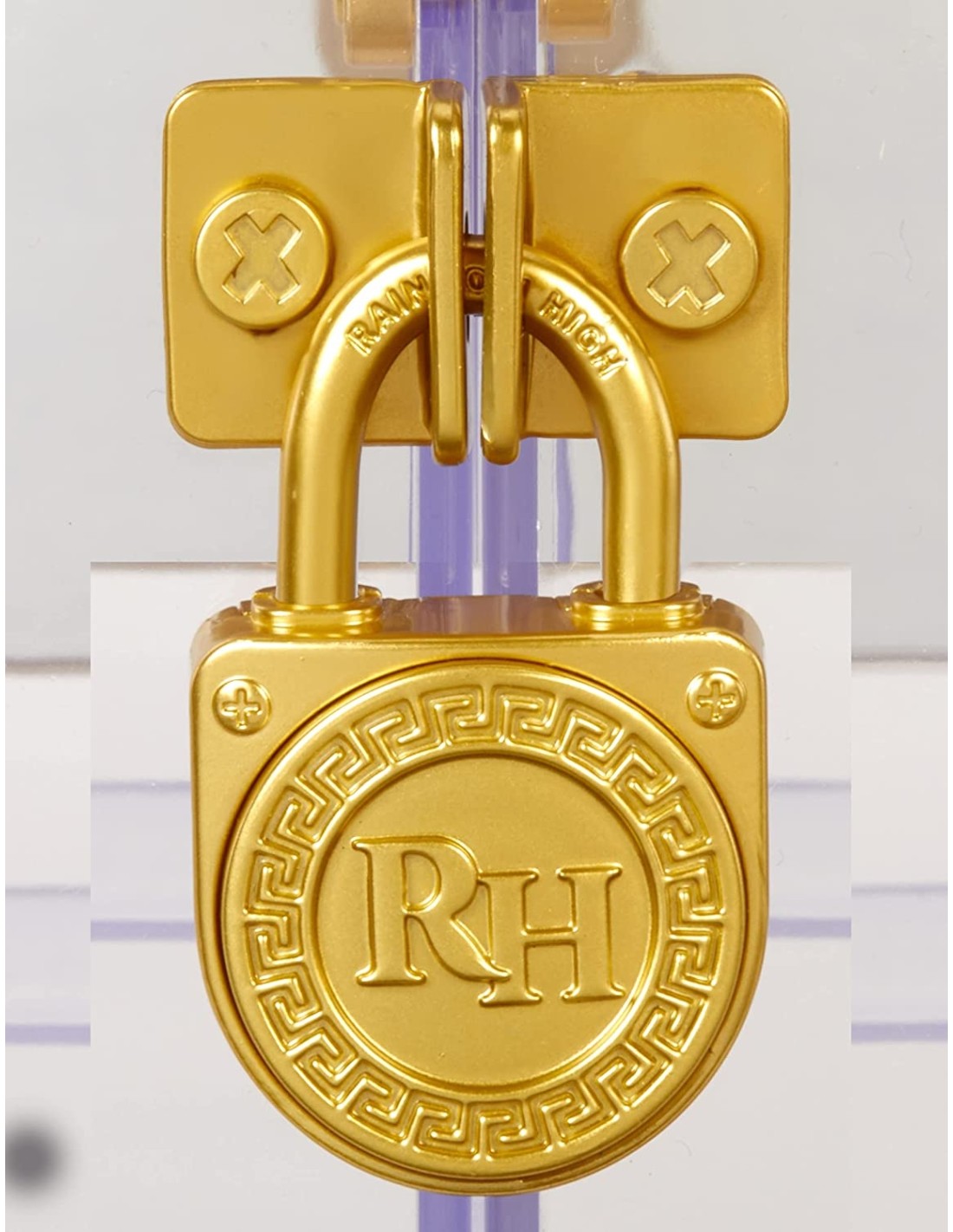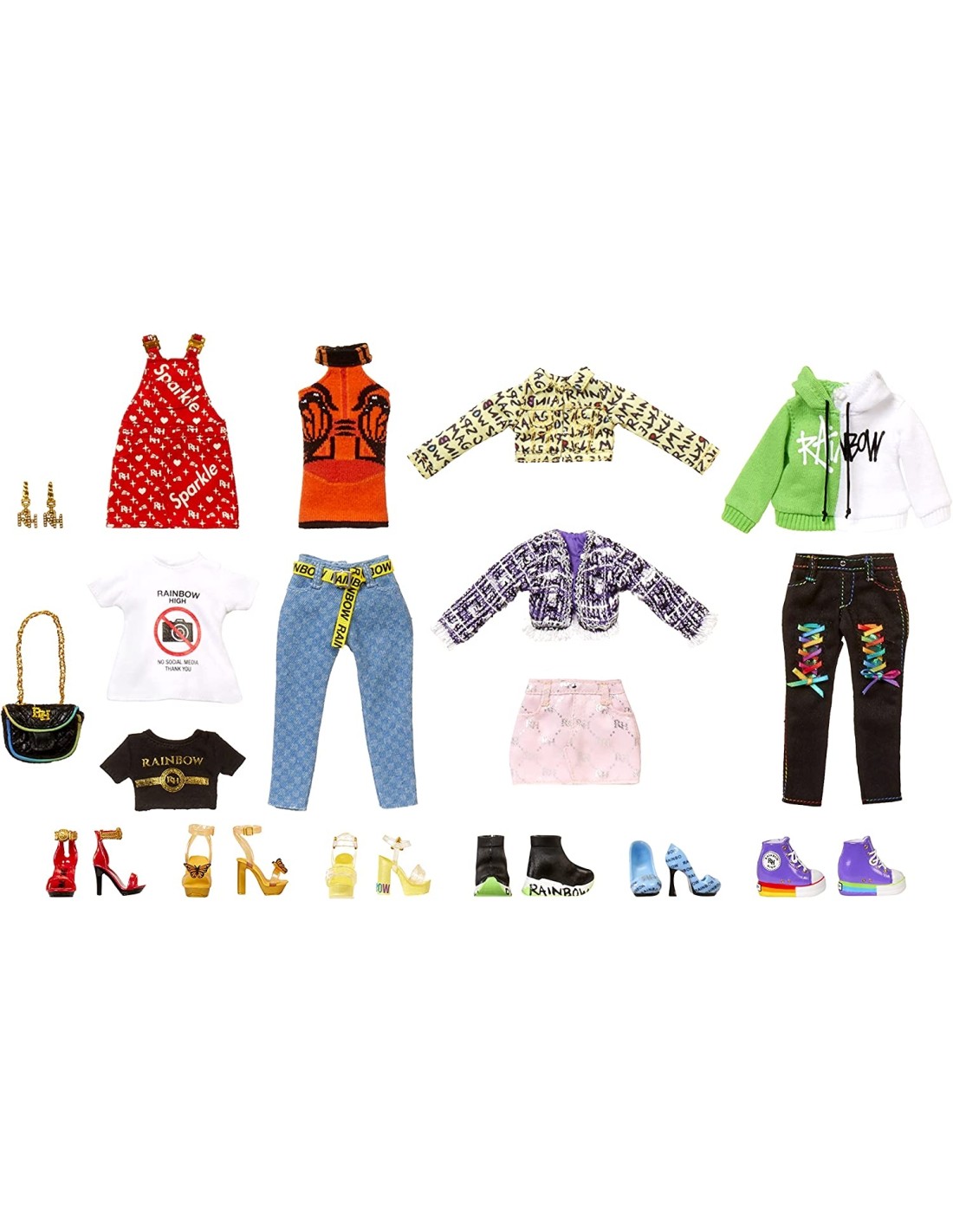 PIÙ DI 400 LOOK: Questo armadio a forma di baule con finiture dorate è dotato di oltre 31 capi da combinare e abbinare per creare più di 400 stili; un sacco di vestiti e accesori per bambole; bambole vendute separatamente GIOCA, METTI IN MOSTRA E ORGANIZZA: Vesti le tue bambole con tutti gli accessori e i vestiti, apri l'armadio per mettere in mostra il suo stile e e organizza tutti i capi con i bauli e gli appendiabiti INCLUDE: Abiti, pantaloni, gonne, top, scarpe e altro ancora; include anche una sedia da trucco con gambe dorate, 10 grucce, uno specchio, un appendiabiti, bauli trasparenti per scarpe e accessori e un lucchetto TRASPORTABILE: Questo armadio è ottimo per riporre tutti i capi e accessori Rainbow High; puoi chiudere l'armadio con il lucchetto e trasportarlo ovunque vada grazie alla maniglia inclusa IL OTTIMO REGALO: Con un sacco di favolosi accessori e vestiti e ore di gioco fantasioso, questo armadio è il regalo ottimo per bambini dai 6 anni in su