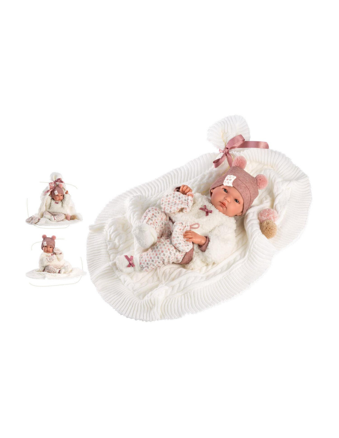 Dolcissima bambola Reborn dal corpo in vinile e con braccia e gambe in morbido tessuto. La bambola Bimba ha una bellissima coperta bianca. Indossa un bellissimo completo 2 pezzi, con muffole abbinate ai pantaloni ed un morbido cappellino con pon pon rosa.