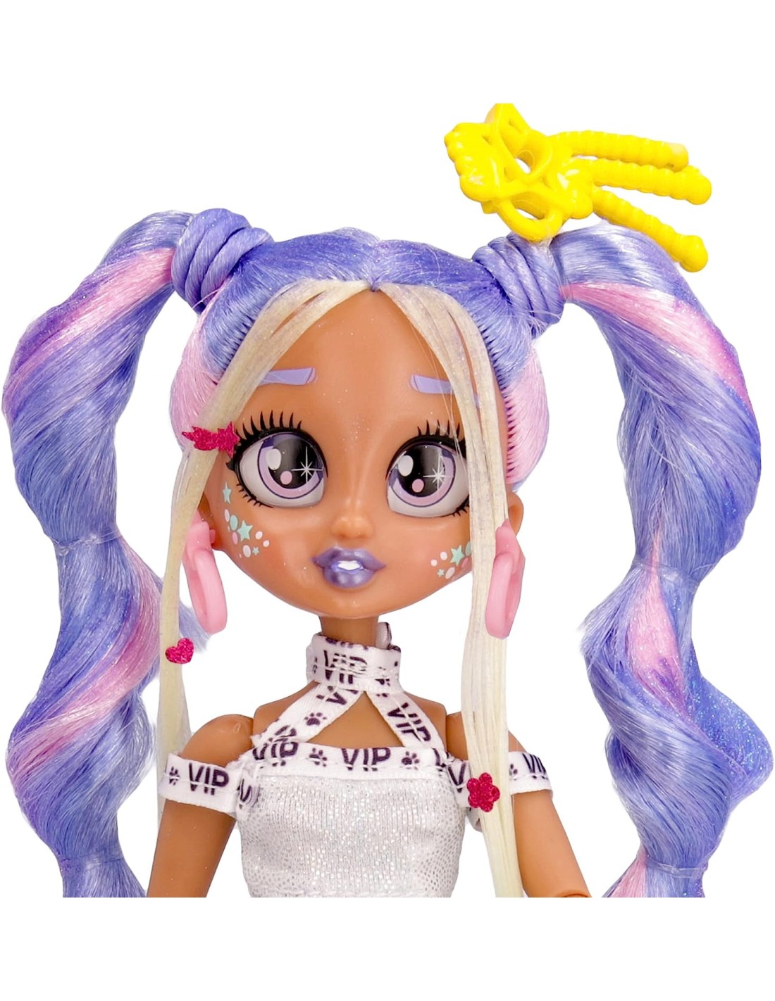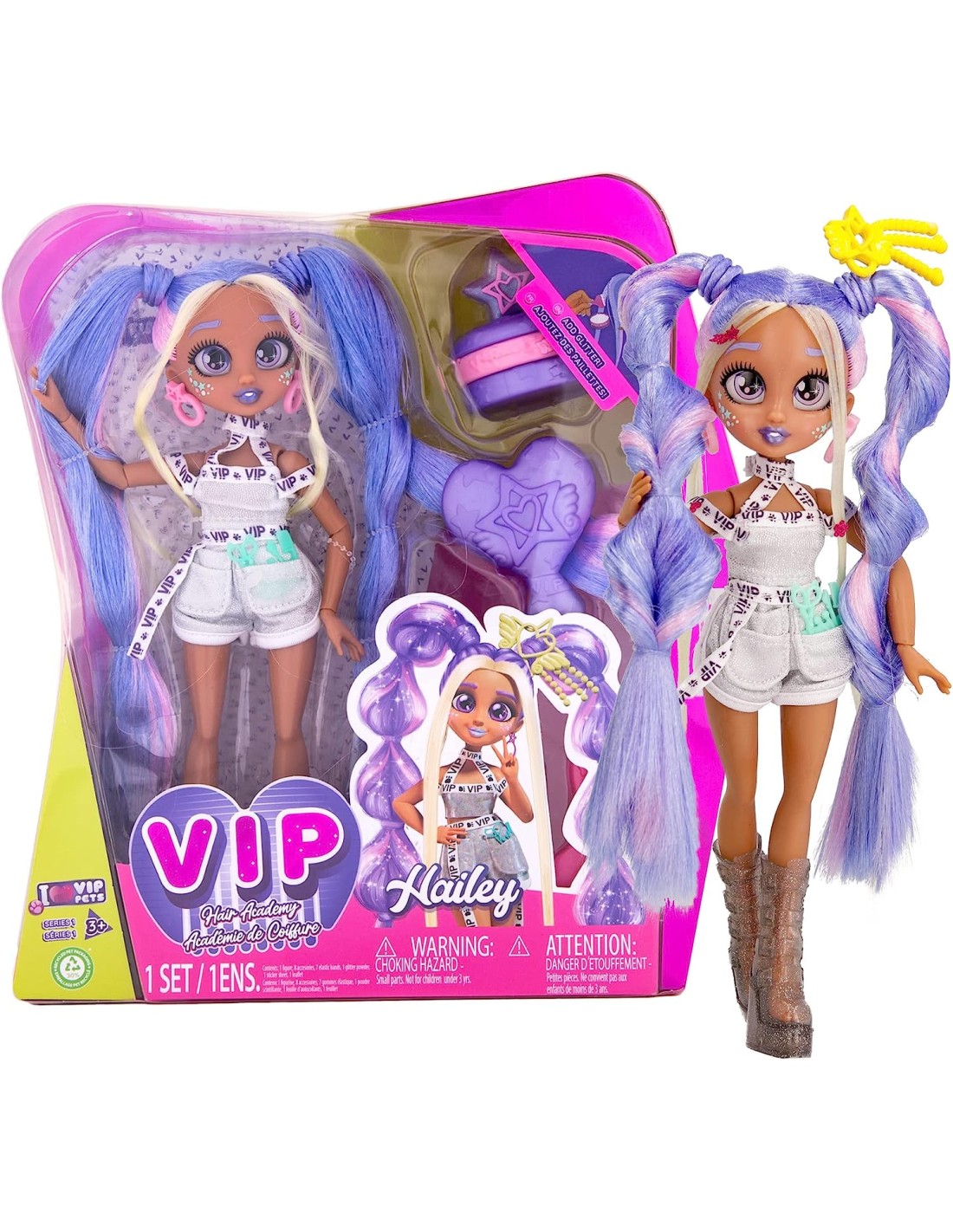 SCEGLI LA TUA FAVORITA Hailey è la padroncina della VIP Pet Mailey; Con lei potrai diventare una vera haistylist CAPELLI EXTRA LUNGHI Hailey ha capelli lunghi 30cm, viola e super scintillanti TANTI ACCESSORI Apri e scopri 7+ sorprese: Include un accessorio per capelli speciale, un vestito, un paio di scarpe, orecchini, un pettine, elastici e un altro accessorio a sorpresa SCOPRI TUTTE LE VIP Sono molto amiche tra loro e si divertono un sacco, mentre imparano come essere delle brave haistylist all'Accademia Ci sono 5 differenti fashion dolls da collezionare PER CHI: Gioco ottimo per tutti i bambini con più di 4 anni d'età che sono fan delle VIP Pets o che amano le bambole fashion e i capelli lunghi BENEFICI DEL GIOCO: Con le VIP Fashion dolls, i bambini si divertiranno a creare tanti look differenti, pettinando i capelli in modi originali e creando nel frattempo divertenti storie con i loro amici; Le possibilità sono infinite; Apprendimento attraverso il gioco: giocare con le bambole fashion VIP stimola la motricità fine e lo sviluppo linguistico e sociale dei bambini Non sono necessarie batterie; Lunghezza capelli: 30 cm; Per bambini da 3 anni in su