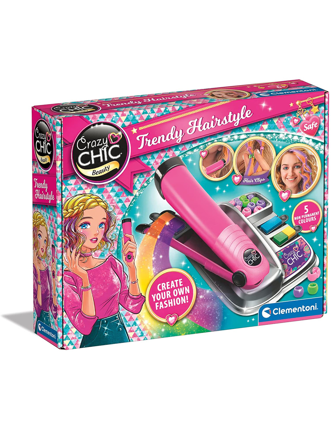 Clementoni- Crazy Chic-Trendy Hairstyle-Piastra con Colore per Decorazione Capelli, Gesso Pettine