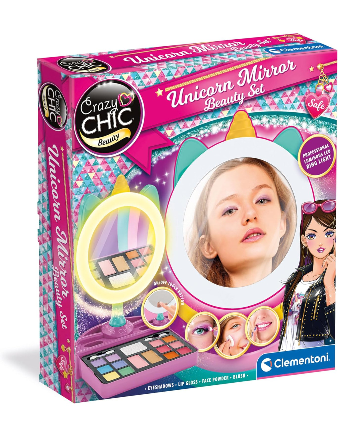 Clementoni- Crazy Chic Unicorn Mirror-Trousse con Cerchio Luminoso, Console con Trucchi Lavabili e Pennelli Professionali, Set Cosmetici Bambina 6 Anni, Make-up Sicuro e Testato, 18855, Multicolore