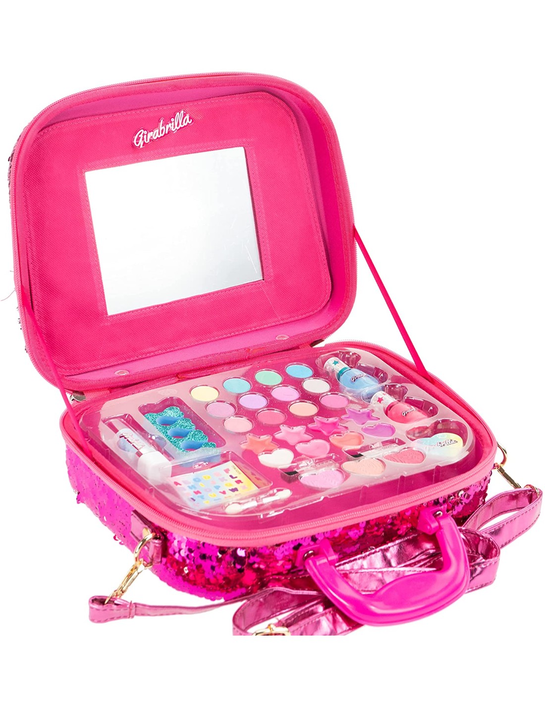 Scintillante valigetta Girabrilla Make Up case MAGENTA/SILVER Rivestita con un magico strato di paillettes reversibili che cambiano colore! All'interno è presente un vassoio make-up con 12 ombretti, 8 lipgloss, 3 fard, 1 lucidalabbra in crema, 2 smalti, 1 separadita, 1 lima a forma di cuore, applicatori per trucco, adesivi per unghie. Prodotto originale Girabrilla. Paraben Free Età consigliata: 6+