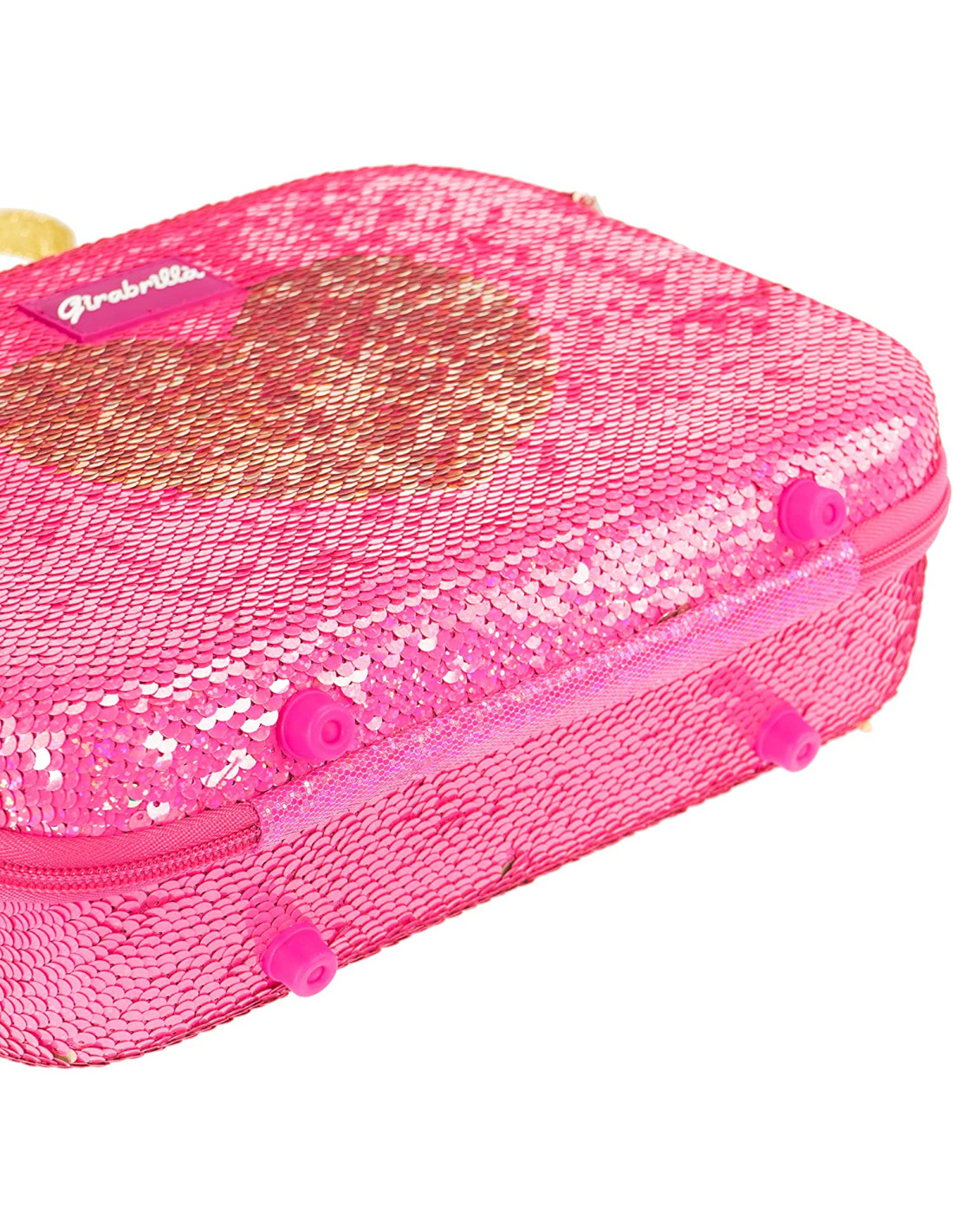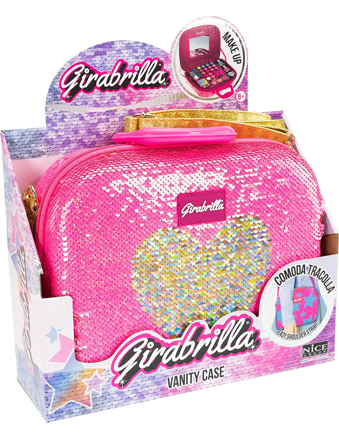 Scintillante valigetta Girabrilla Make Up case ROSA Cuore ORO Rivestita con un magico strato di paillettes reversibili che cambiano colore! All'interno è presente un vassoio make-up con 12 ombretti, 8 lipgloss, 3 fard, 1 lucidalabbra in crema, 2 smalti, 1 separadita, 1 lima a forma di cuore, applicatori per trucco, adesivi per unghie. Prodotto originale Girabrilla. Paraben Free Età consigliata: 6+