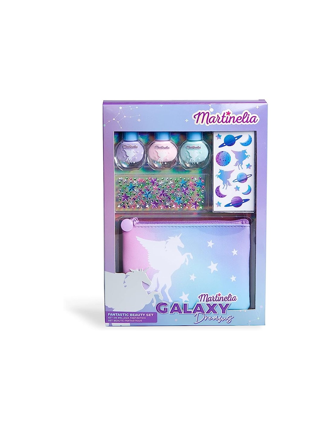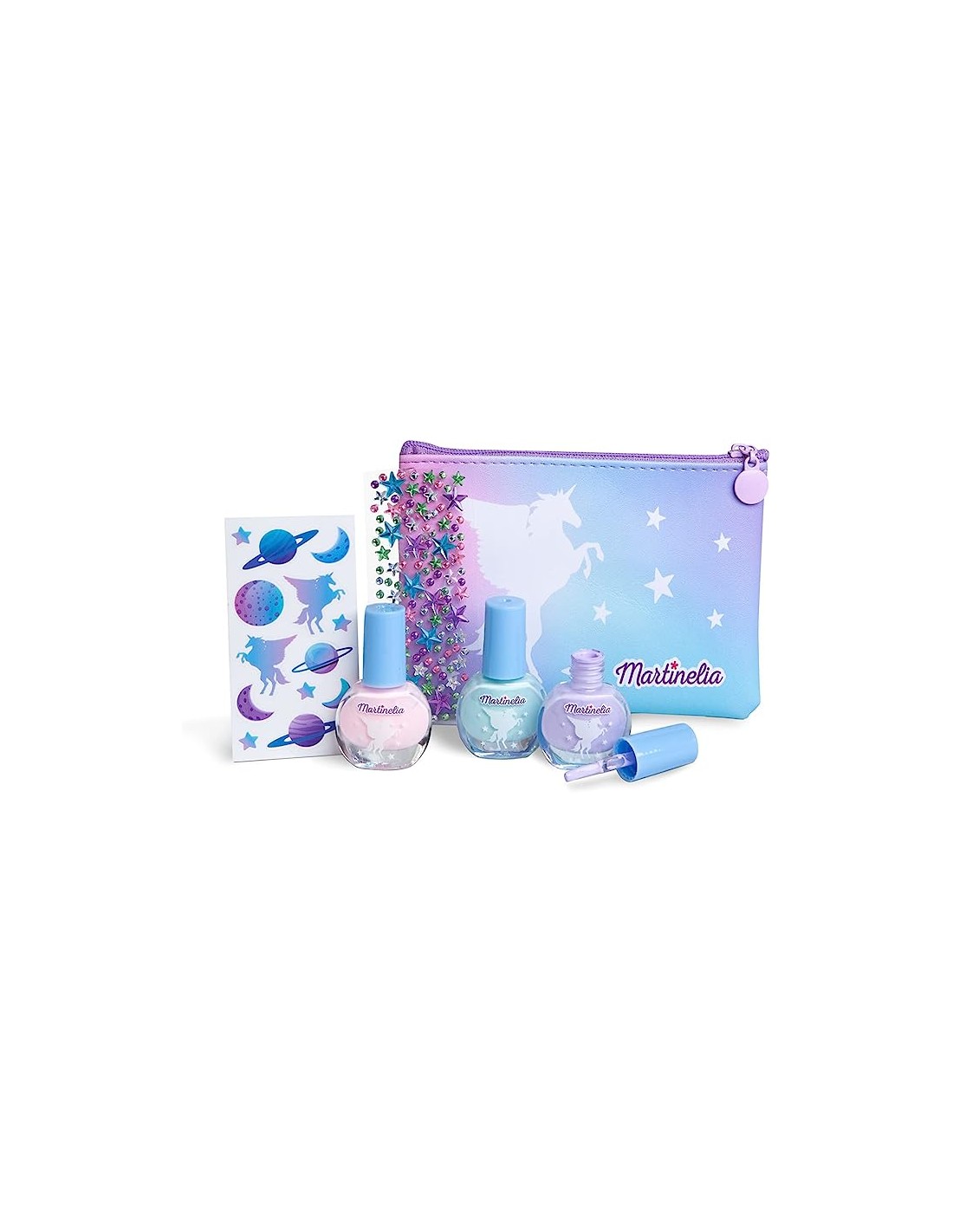 Senti il potere della galassia con questo set completo che include tre smalti per unghie, diamanti multicolori, tatuaggi pegaso, pianeti, lune e stelle e una pratica trousse per cosmetici.