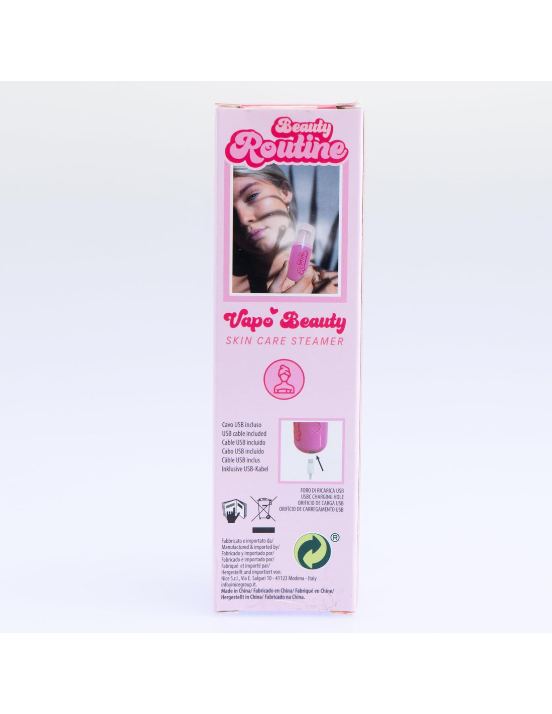 CARATTERISTICHE: piccolo ed elegante, il “Vapo Beauty Skin Care Steamer” per viso può essere riposto in borsetta, zainetto e persino tasche. L'interruttore a bottone è facile da premere ed è collocato sotto alla porta dello spray. La luce notturna incorporata è blu quando acceso e in funzione e rossa quando è in carica, collegata tramite cavo usb alla presa elettrica. Il serbatoio, che contiene acqua ha capienza 30 ml, si svita e avvita e ha un design a prova di perdite di liquidi.