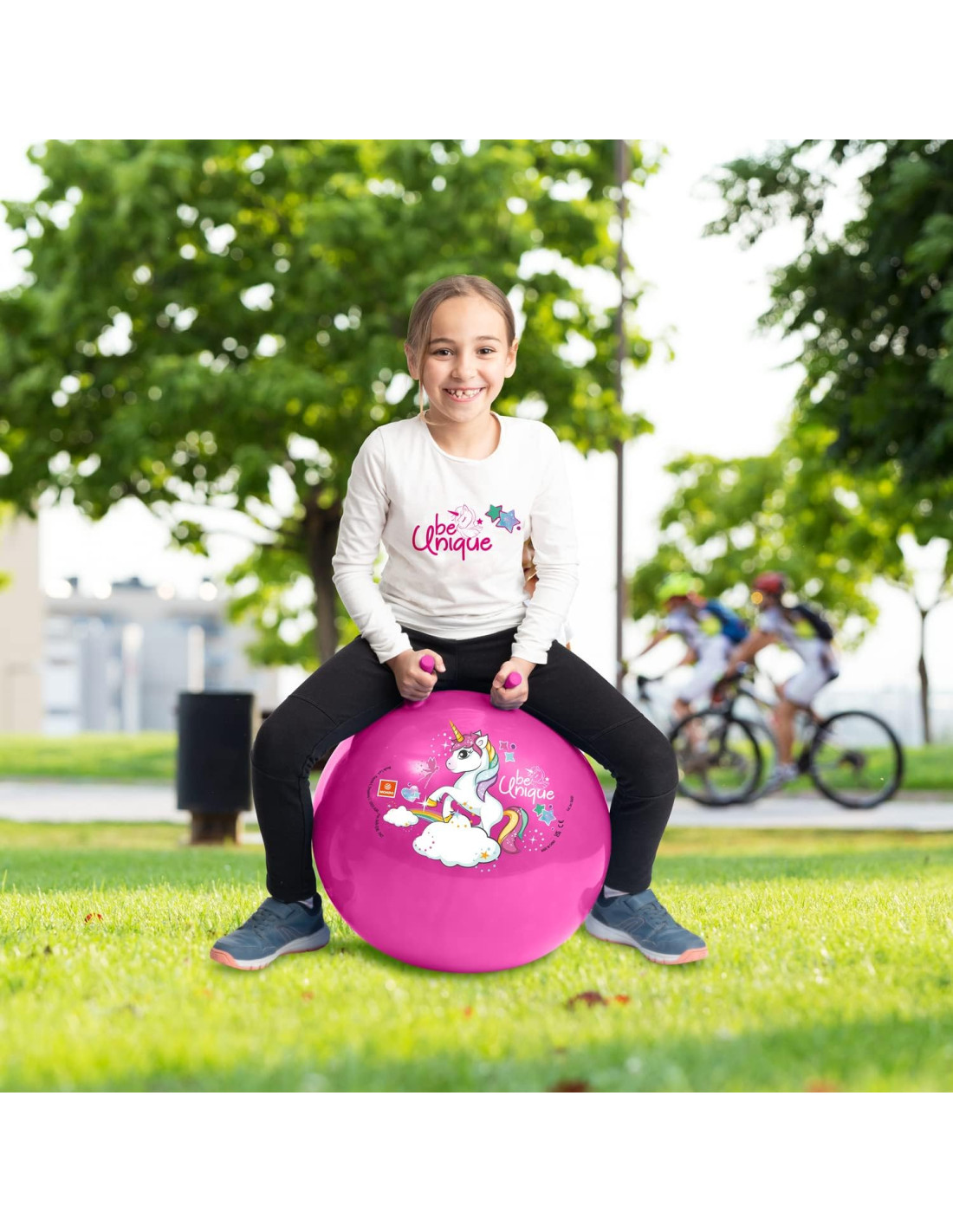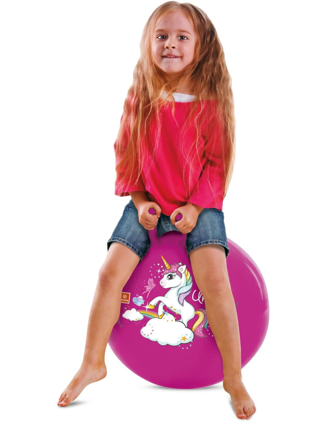 Dimensioni - la palla per saltare, con il suo diametro di 145cm, è adatta a bambini dai 3 anni in su Materiale - il materiale robusto e le maniglie simili a 2 orecchie garantiscono la massima stabilità durante i salti, sia all'aperto al parco che al chiuso in casa Grafica unicorn - le grafiche di questa palla salterina perfetta per far divertire bambini e bambine, sono ispirate al celebre cartone unicorn Palla multifunzione - la palla gioco può essere utilizzata anche come palla per sedersi, ideale per insegnare al bambino / bambina una postura più corretta Gonfiabile - questa palla per fare saltare i bambini si può gonfiare con qualsiasi pompa per palloni, non inclusa nella confezione