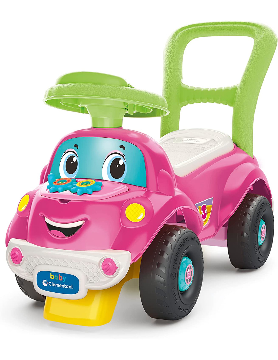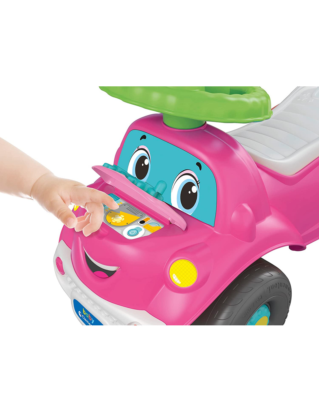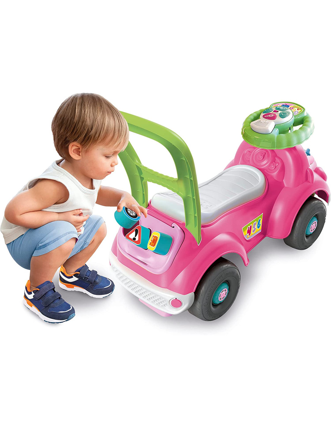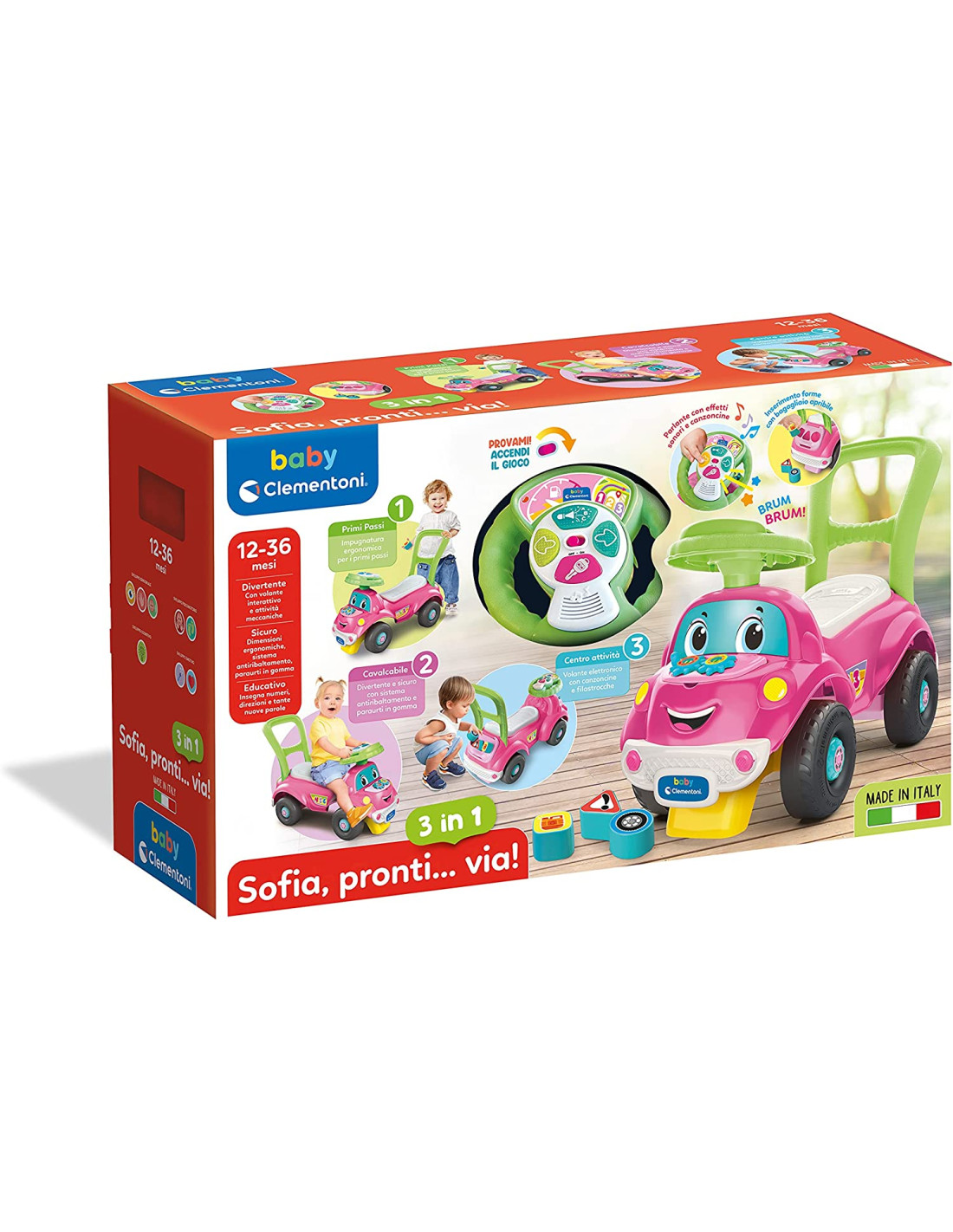 SOFIA PRONTI VIA 3 IN 1: Una macchinina dal design unico con 3 diverse funzioni: cavalcabile, primi passi e centro attività MACCHINA CAVALCABILE: Questo cavalcabile è studiato fin nei minimi dettagli, con ruote sterzanti, sistemi antiribaltamento e paraurti in gomma morbida per risultare ergonomico, sicuro e confortevole ELETTRONICO LUCI E SUONI: Il volante elettronico con tanti suoni e canzoni, cattura l'attenzione del bambino e ne stimola la curiosità e l'udito. Premendo la chiave si attiva la modalità con effetti sonori realistici, per stimolare l'immaginazione e il gioco imitativo ATTIVITÀ MECCANICHE: Gli ingranaggi da girare per "riparare il motore" e le formine da inserire e recuperare dal bagagliaio, supportano lo sviluppo psicomotorio del bambino CARATTERISTICHE: Un gioco dall'approccio ecosostenibile realizzato per oltre l'80% in plastica riciclata di alta qualità, e confezionato con materiali 100% riciclati. Gioco bambini 1 anno Made in Italy con batterie incluse