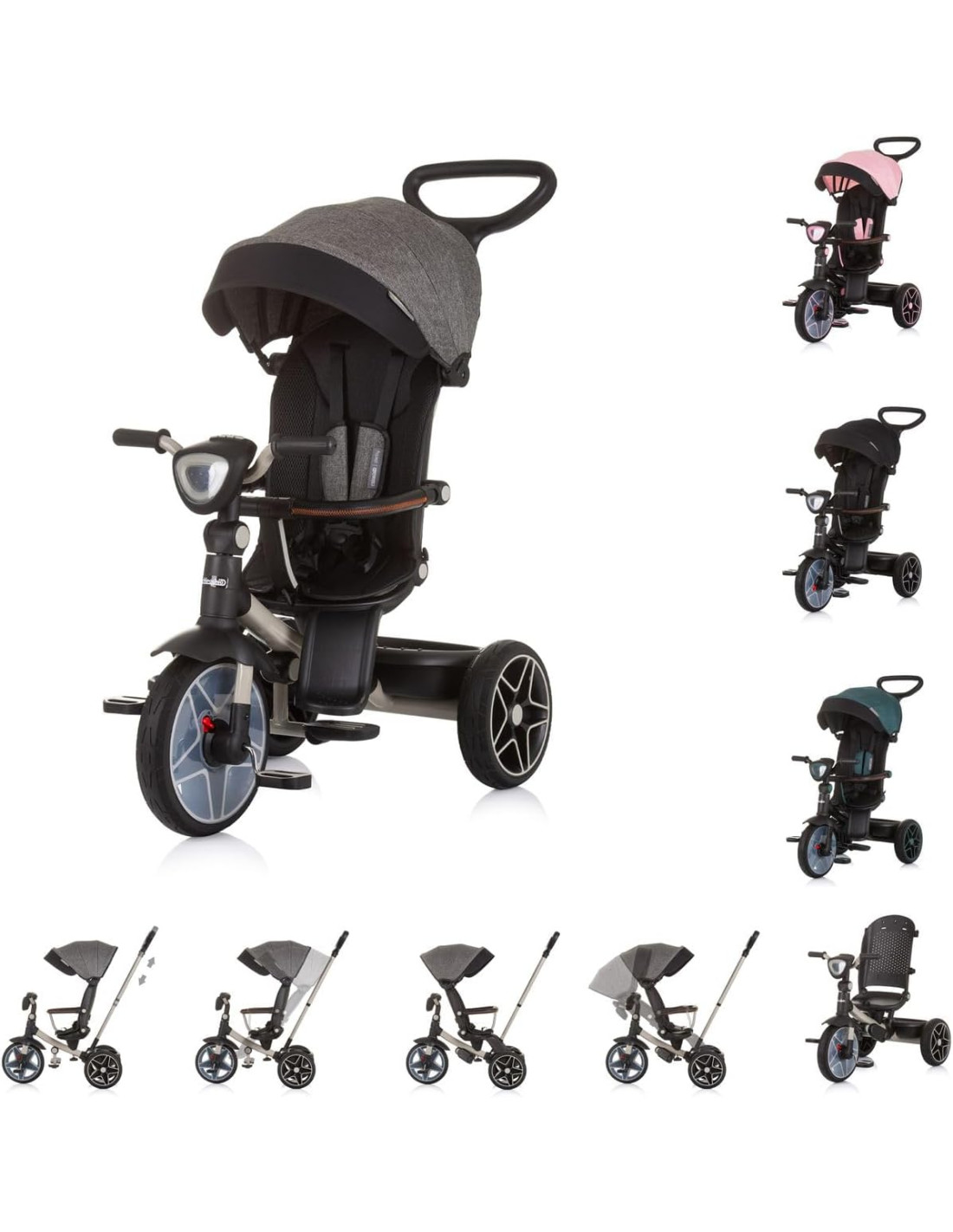 Cestino posteriore, pedali del freno sulle ruote posteriori, coprimozzo sulla ruota anteriore per evitare che i piedi dei bambini rimangano intrappolati, tettuccio pieghevole con protezione solare aggiuntiva FPS50+, ruota anteriore bloccabile
