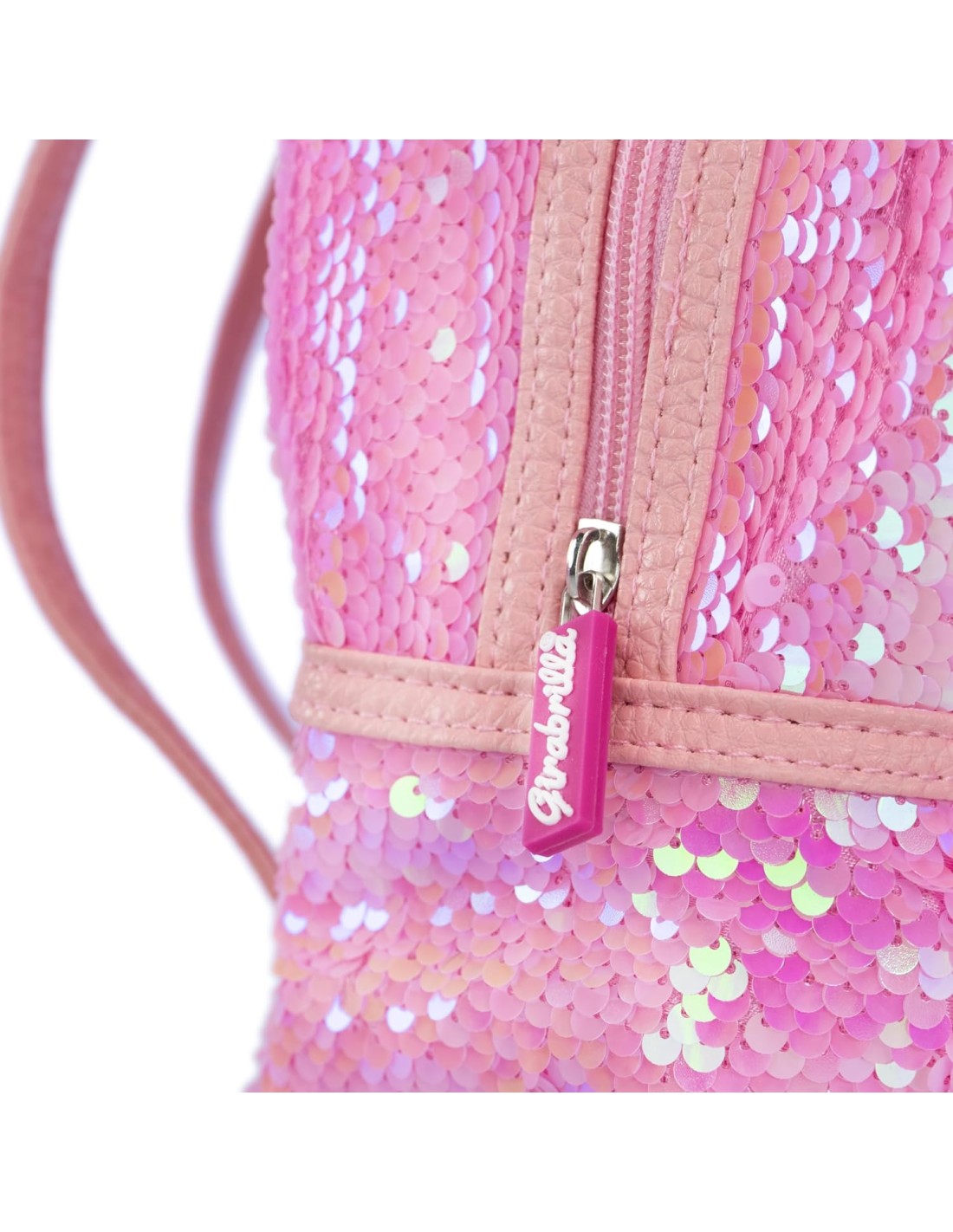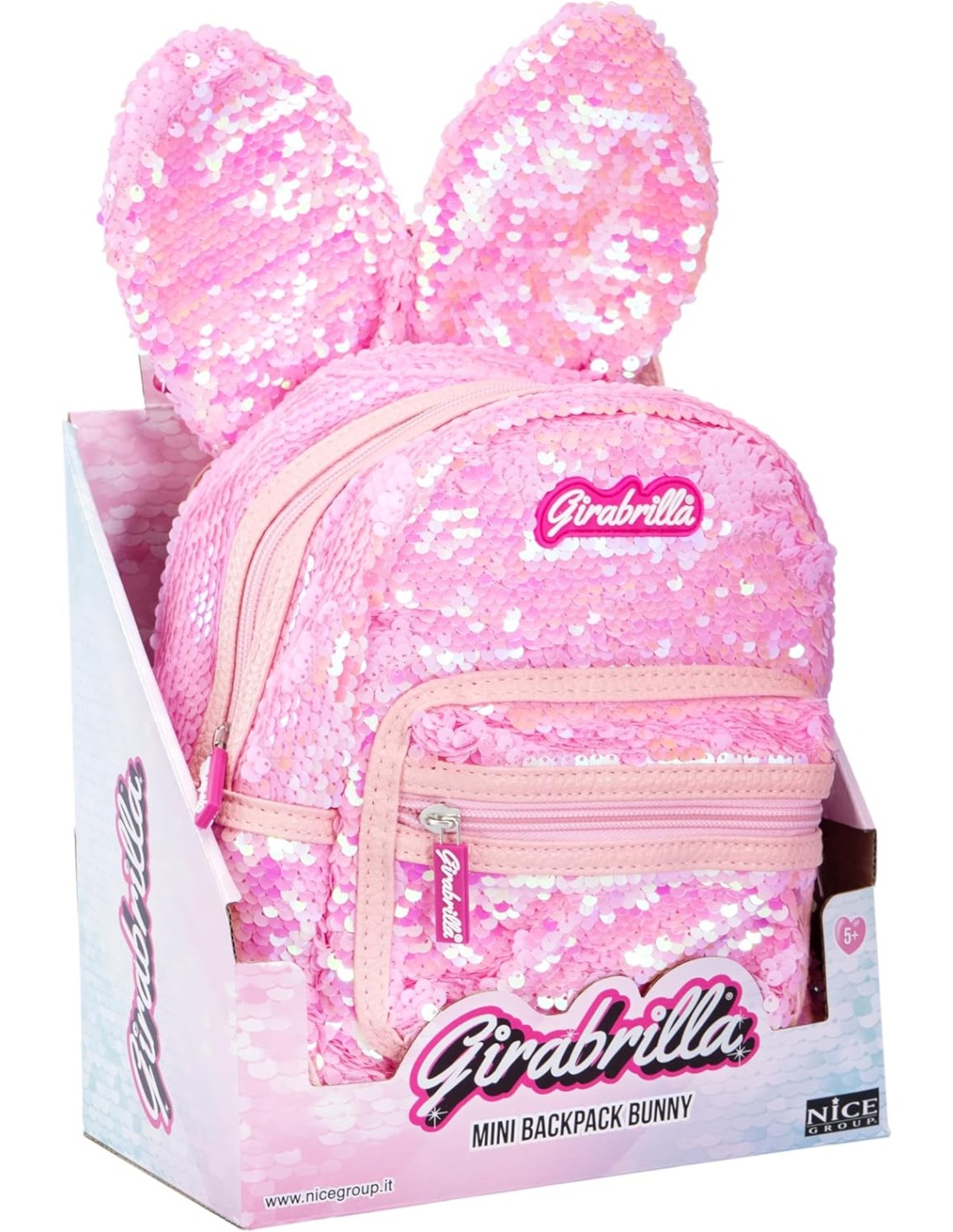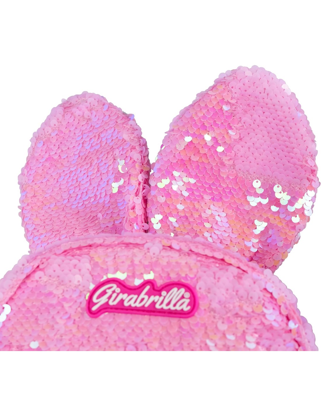 GIRABRILLA BUNNY: zainetto scintillante con dolcissime orecchie da coniglietto, rivestito da uno strato di paillettes scintillanti e reversibili.