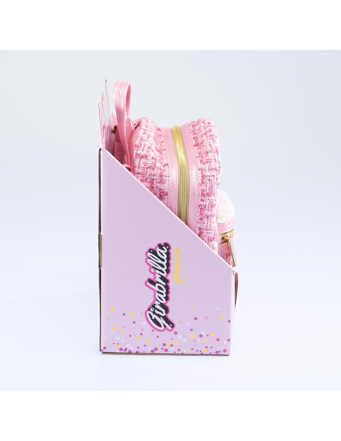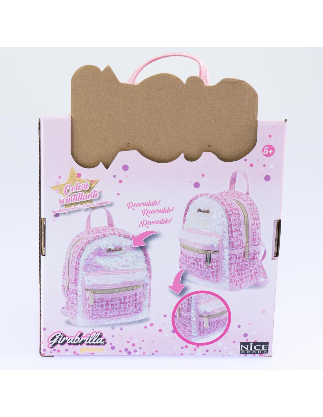 GIRABRILLA TWEED BACKPACK: zainetto in tessuto stile tweed con maniglia, rivestito da uno strato di paillettes scintillanti e reversibili sul lato frontale. Disponibile nella colorazione rosa.
