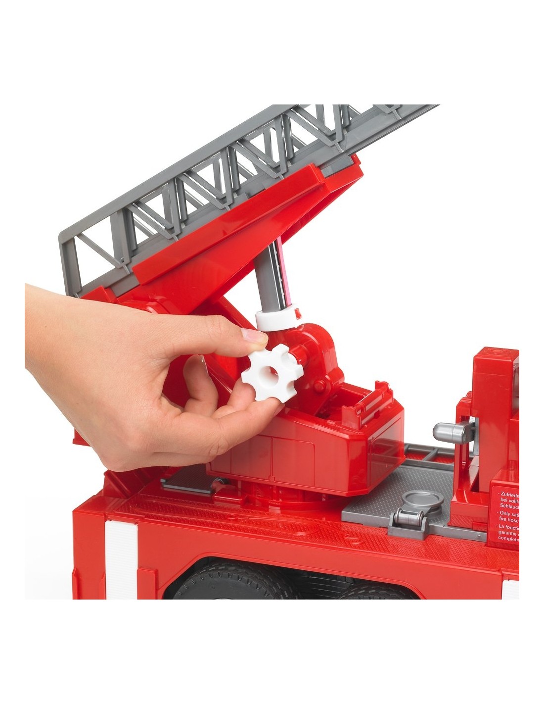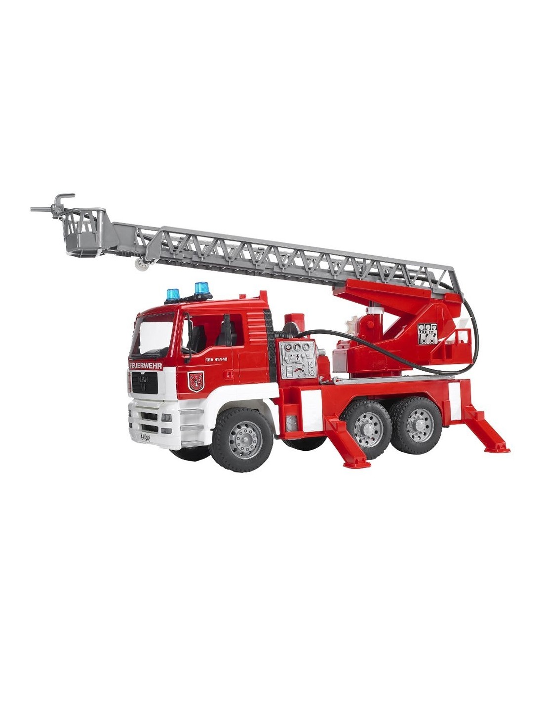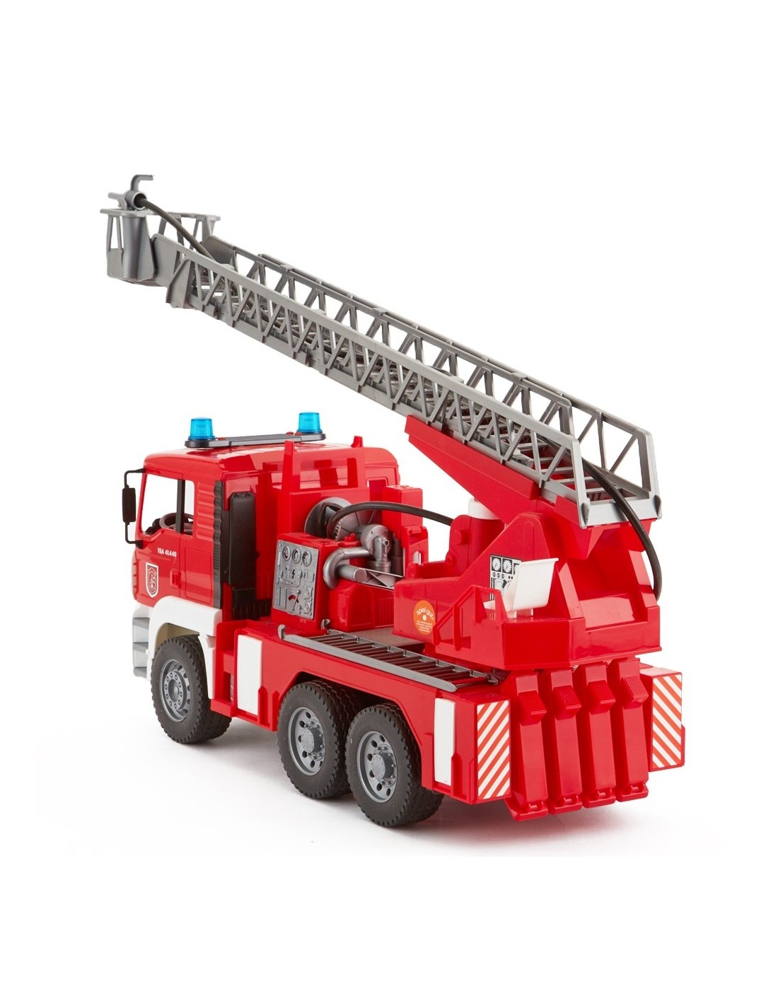 Perfetta riproduzione dell'autopompa dei pompieri MAN TGA in scala 1:16. Premendo un bottone le luci e la sirena si accendono davvero! Inoltre riempiendo l'apposito serbatoio con acqua potrai spruzzare acqua dalla pompa posizionata in cima alla scala, proprio come un vero pompiere! Dimensioni: 470 x 175 x 242 mm. Batterie incluse. Età 4+