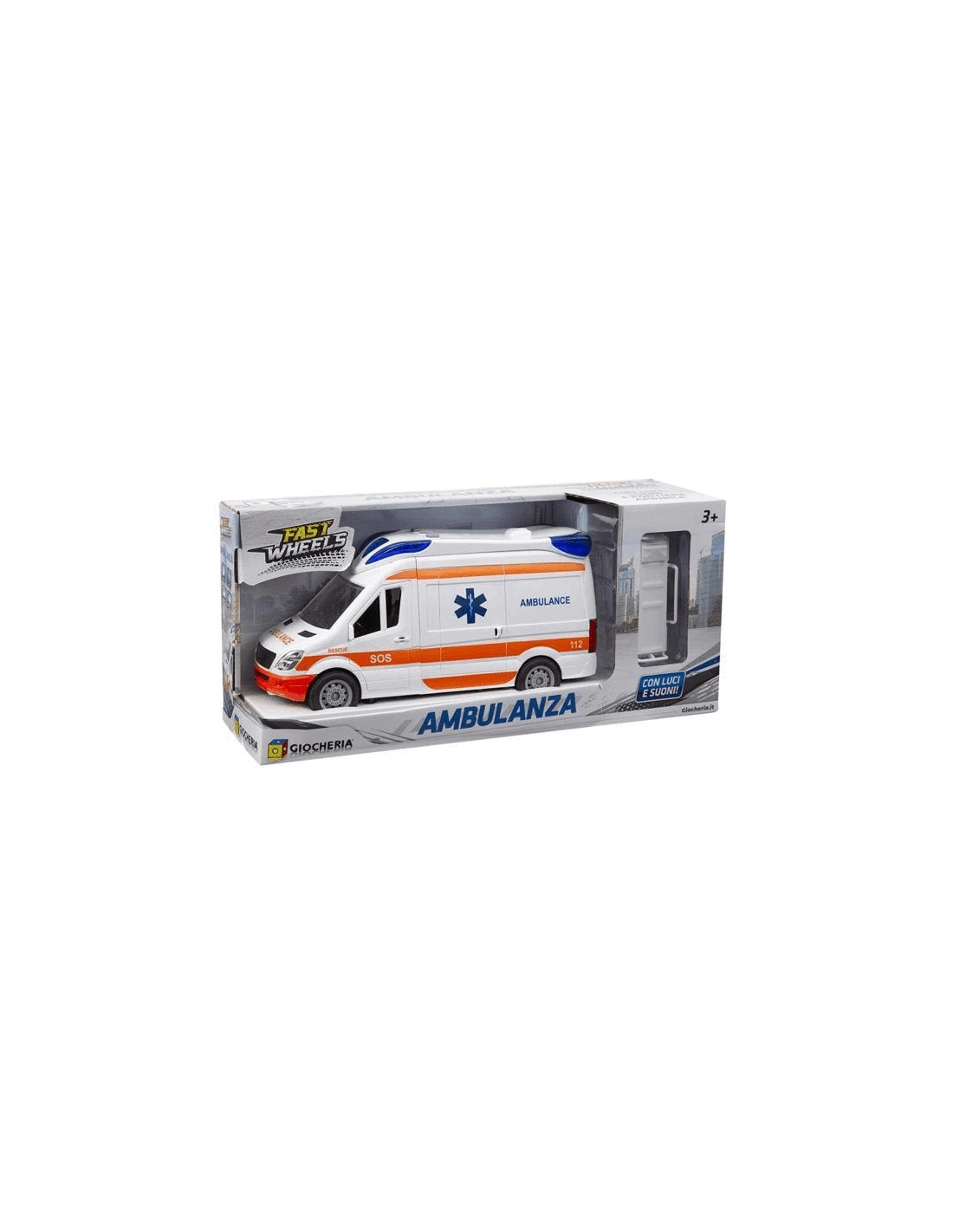 Ambulanza con luci e suoni e movimento a ruote libere. Portiere apribili e meccanismo di uscita della barella.