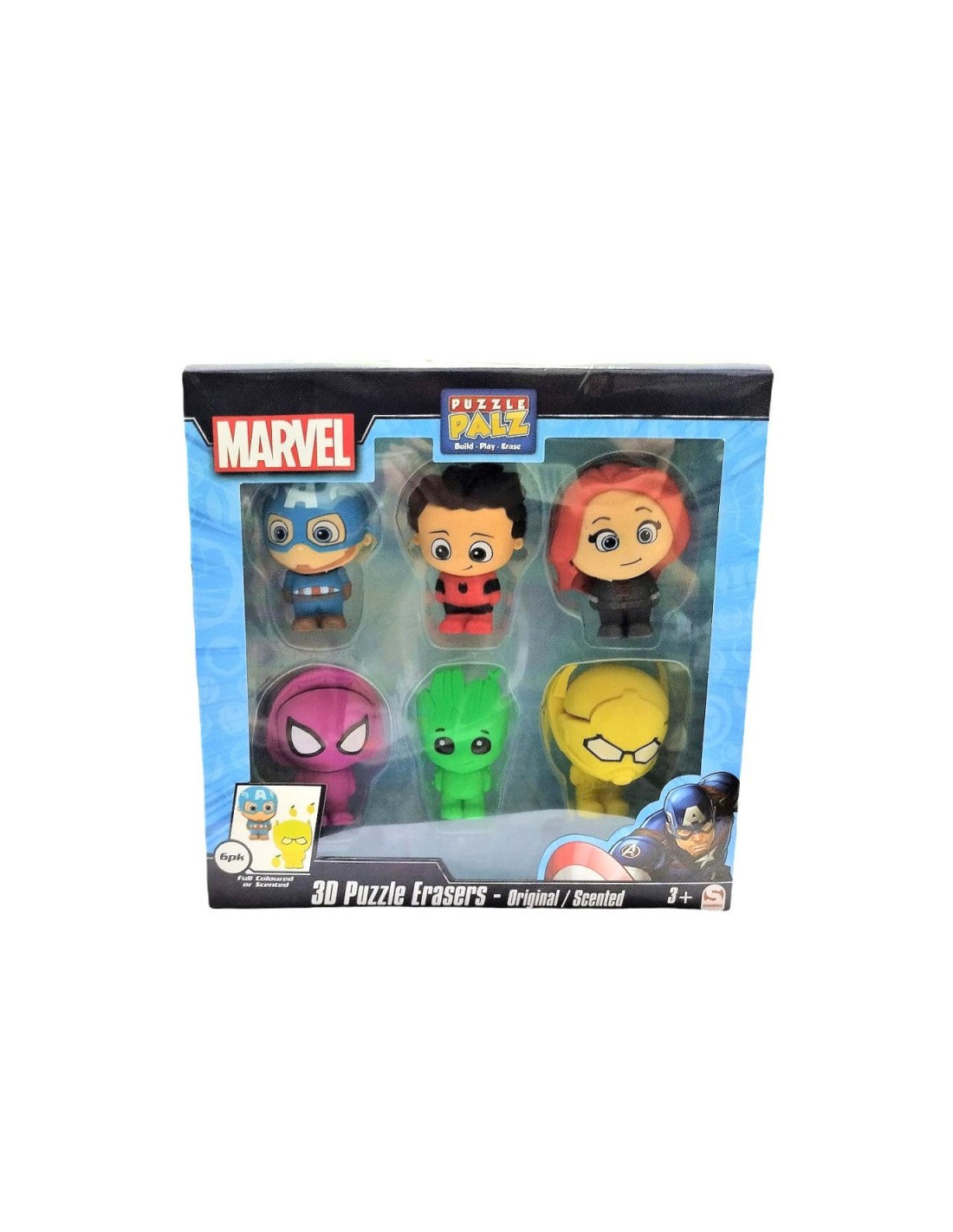 Figure in gomma profumata con gli eroi Marvel: Capitan America, Uomo Ragno, Vedova Nera, Ragno fantasma, Groot, Uomo formica. Metti insieme le gomme e vedrai i tuoi eroi preferiti. Gomme in diversi colori e profumazioni tra cui limone, caramello, fragola, uva, mirtillo, anguria. Puo' essere utilizzato anche come puzzle 3D: i singoli elementi si staccano l'uno dall'altro e possono essere combinati liberamente per creare un eroe completamente nuovo!