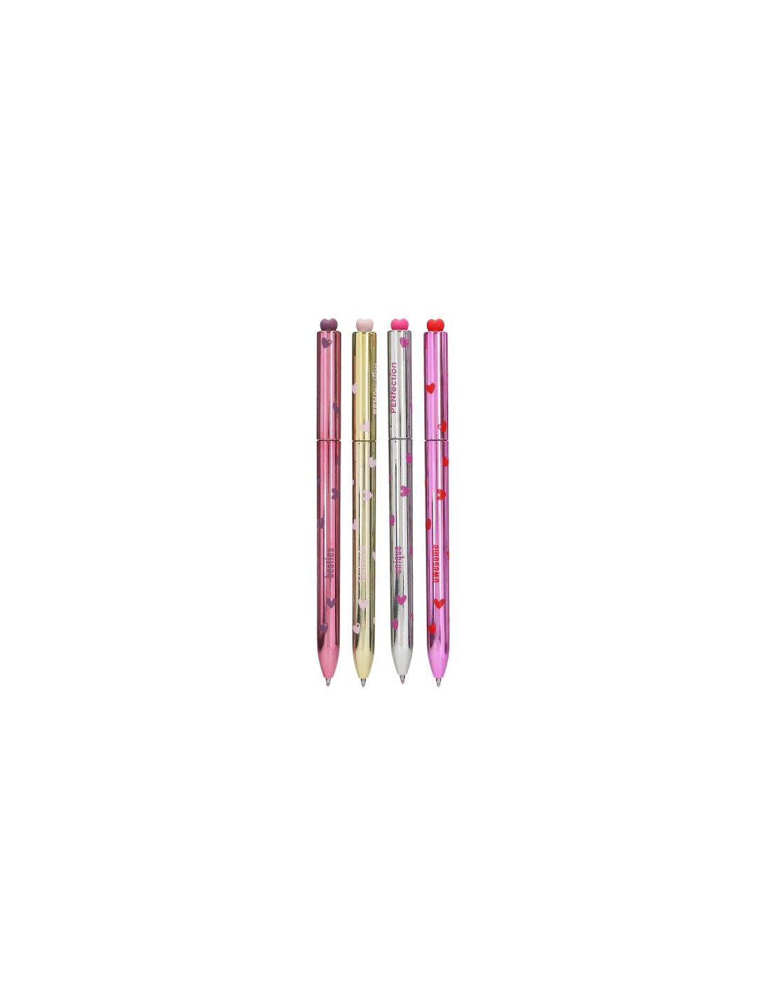 Scrivi, cancella, riscrivi: è semplice con le penne gel PENfection! La mina si estrae girando il tappo, girando nell'altro verso rientra. Girando appare un topper con gomma per cancellare a forma di cuore. Quattro design dal look metallizzato con cuori all-over e statement: penna oro rosa con cuori viola e BESTIES, penna oro con cuori rosa e SOULMATE, penna argento con cuori rosa e UNIQUE e penna rosa con cuori rossi e AWESOME. Inchiostro blu, mina non sostituibile.
