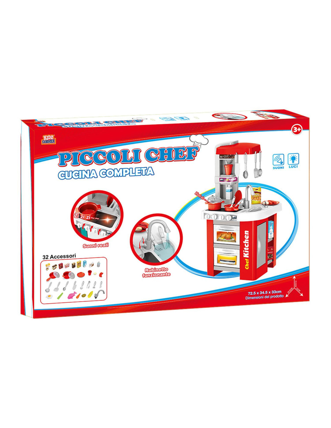 La Cucina del piccolo Chef con 32 accessori inclusi. Benvenuti nella Cucina del piccolo Chef, un mondo di gioco e apprendimento per i piu' giovani aspiranti cuochi! Questa cucina giocattolo e' molto piu' di un semplice gioco, e' una reale riproduzione di una cucina con caratteristiche uniche per stimolare l'immaginazione e l'apprendimento. La cucina e' in grado di ricreare gli stessi effetti sonori di una cucina reale, come il rumore del fuoco. Il rubinetto della cucina rilascera' effettivamente acqua, il che rendera' l'esperienza di cucina ancora piu' coinvolgente.
