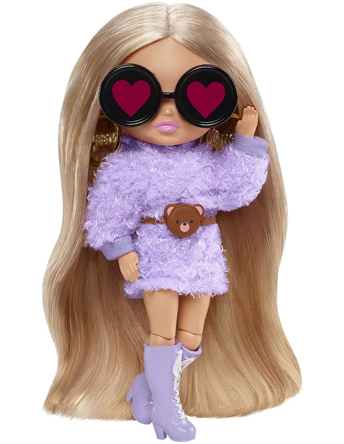 Le Barbie Extra Minis sono bambole da 14 cm con look da capogiro, accessori e capi all'ultimo grido, oltre a un piedistallo Barbie Extra Minis. Questa bambola Barbie Extra Minis sfoggia capelli biondi extra lunghi e un soffice abitino viola con orecchie da orsacchiotto coordinate. I suoi accessori, come gli occhiali da sole a cuore, gli orecchini glam, il marsupio orsacchiotto e gli stivali alti viola rendono il suo look ancora più ineguagliabile! Grazie al piedistallo incluso, oltre alle ginocchia e i gomiti flessibili, questa piccola bambola da collezione è perfetta per giocare con la moda o creare una collezione di Barbie Extra Minis tutta da esporre. Le bambole Barbie Extra Minis sono un regalo fantastico per i bambini dai 3 ai 10 anni, soprattutto per quelli che amano lo stile extra!