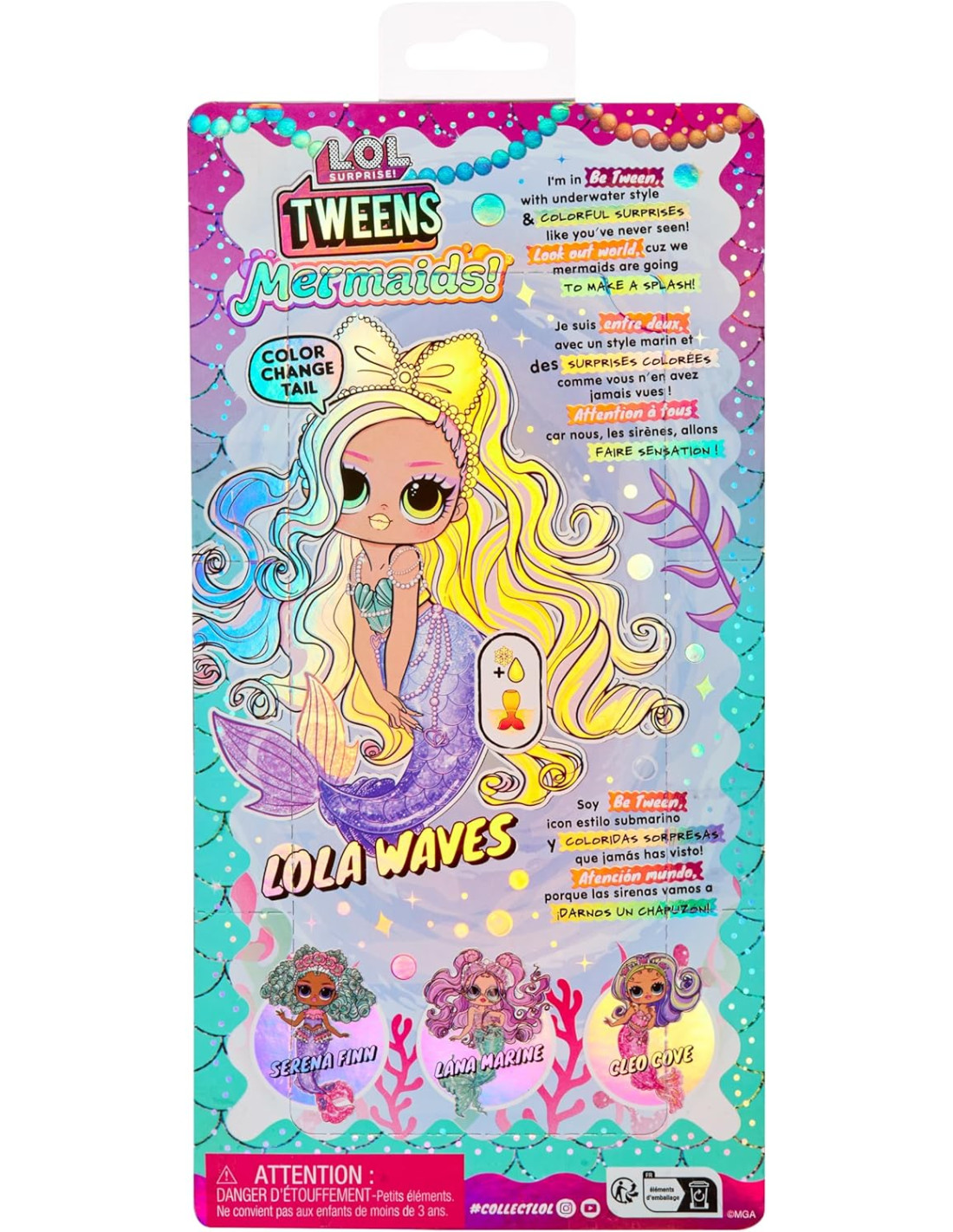 SCOPRI COSA C'È DENTRO: Preparati a tuffarti in un mondo incantevole di magia e sorprese a colori con la Bambola alla moda L.O.L. Surprise! Tweens Mermaid Lola Waves con accessori sfavillanti da scoprire CODA CHE CAMBIA COLORE: Immergi la bambola Mermaid Tweens nell'acqua fredda e guarda come la sua coda cambia colore dal blu cobalto al lavanda, creando una magica esperienza subacquea ideale per il bagno e il gioco creativo PINNE MOBILI: Lola Waves porta un tocco di eccitazione con la sua pinna ipnotica che può muoversi avanti e indietro SCOPRI ACCESSORI CARINI: Non dimenticare di abbellire la tua bambola con i suoi affascinanti accessori, tra cui le sfumature del mare, il diadema di conchiglie e la cintura di perle SNODATA PER POSE INFINITE: La bambola è snodata per un'infinità di pose favolose, tra cui quella seduta: si piega all'altezza della vita, sta in piedi sulla pinna per acconciare la bambola più facilmente e con maggiore stabilità COLLEZIONALE TUTTE: Colleziona tutte e 4 le affascinanti bambole alla moda L.O.L. Surprise! Tweens Mermaid: Cleo Clove, Lola Waves, Lana Marine e Serena Finn per un set completo di divertimento infinito da sirena