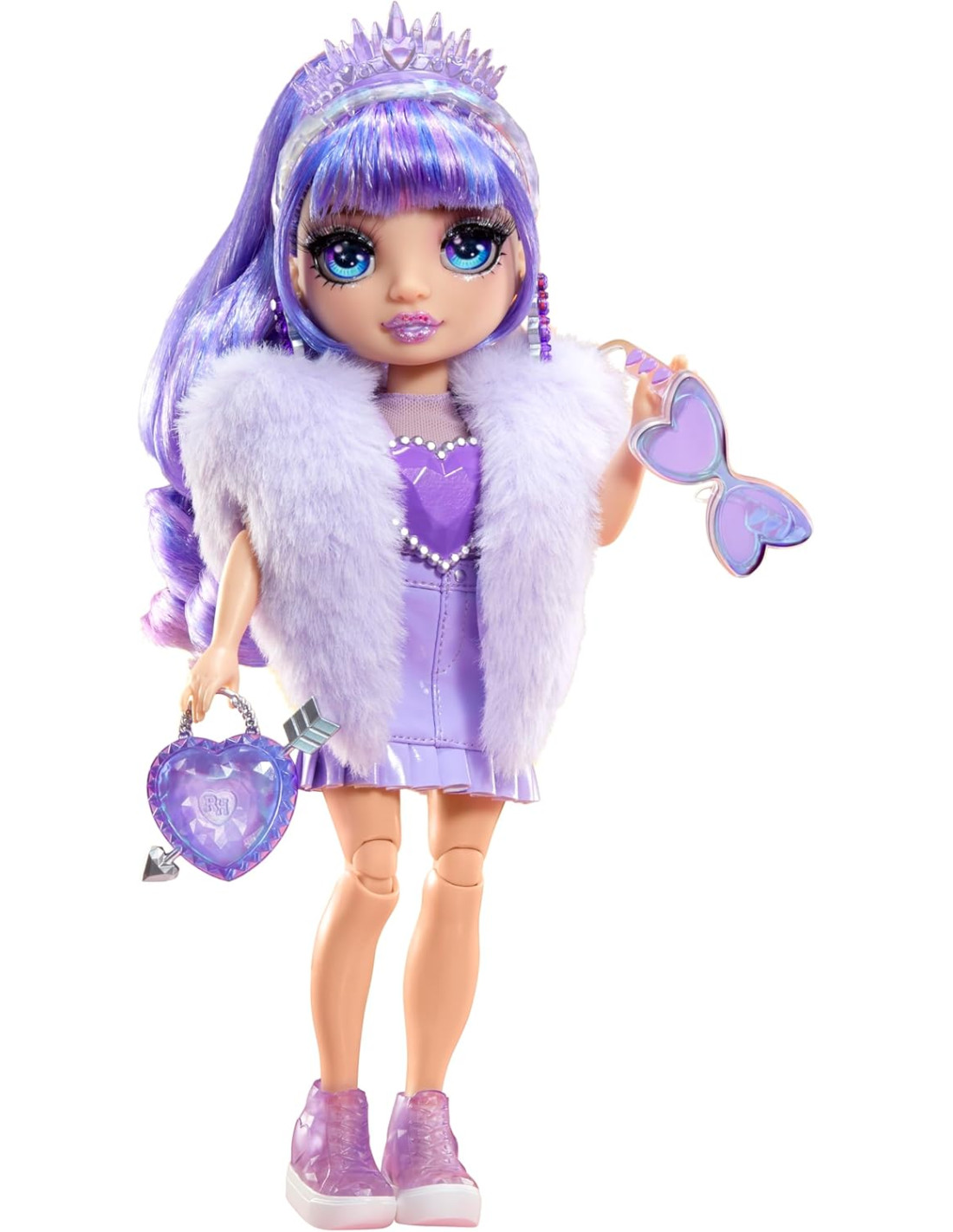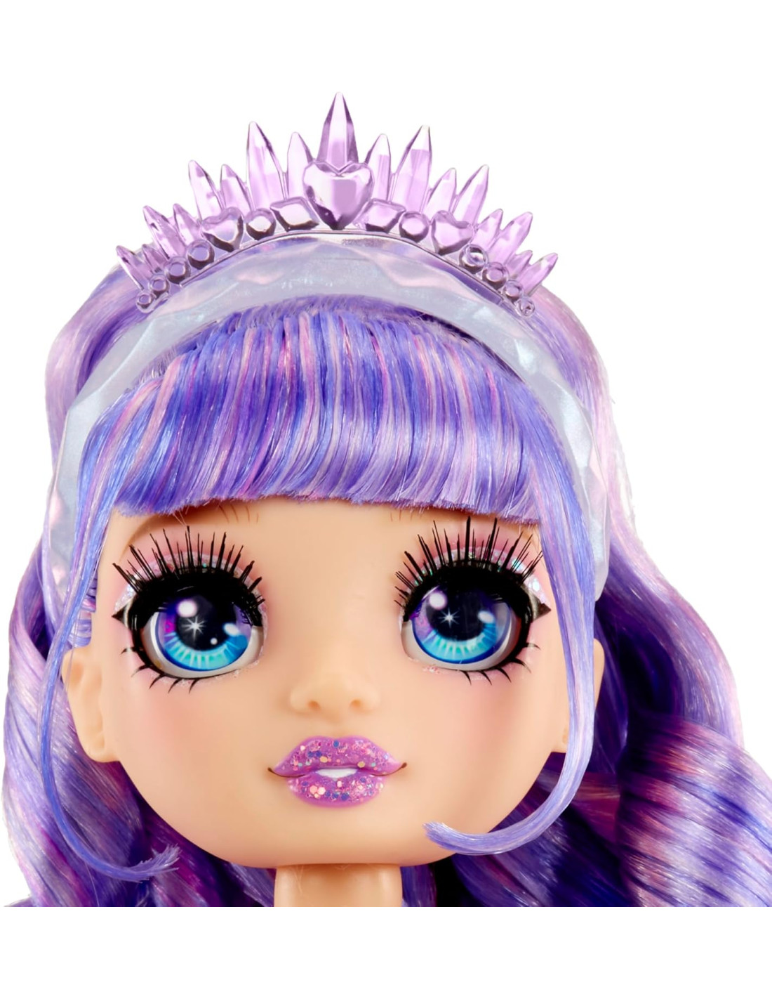 BRILLA IN VIOLA: Violet è vestita con il suo caratteristico viola dalla testa ai piedi, con tanti scintillii. Ha splendidi lineamenti dettagliati, bellissimi capelli lunghi viola, ciglia lunghe e occhi di vetro