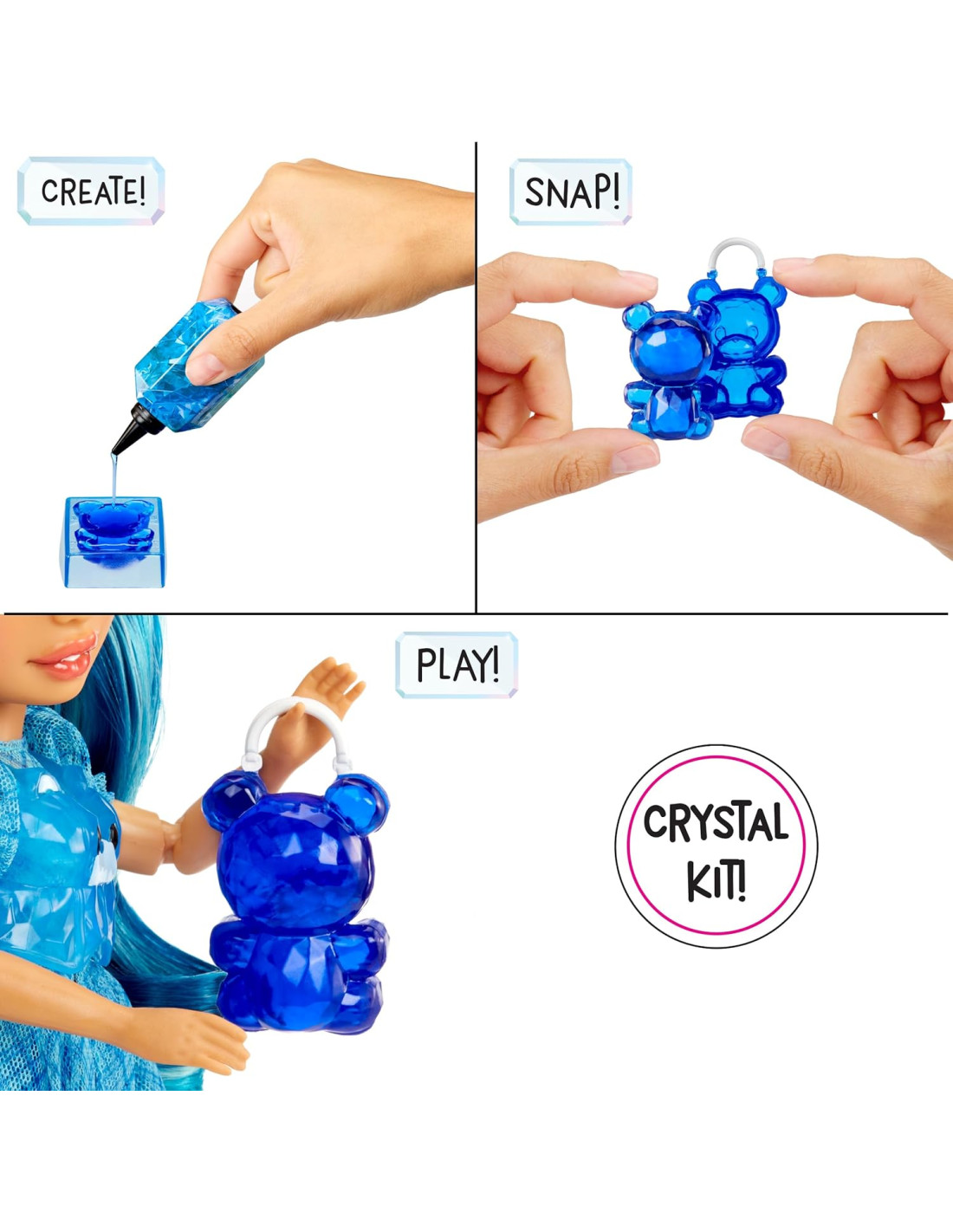 COSÌ FACILE: versa la resina nello stampo. Metti in posa alla luce del sole per qualche minuto. Estrai il cristallo dallo stampo. Inserisci il cristallo nel supporto. Gioca con la bambola e con tutti i bellissimi accessori