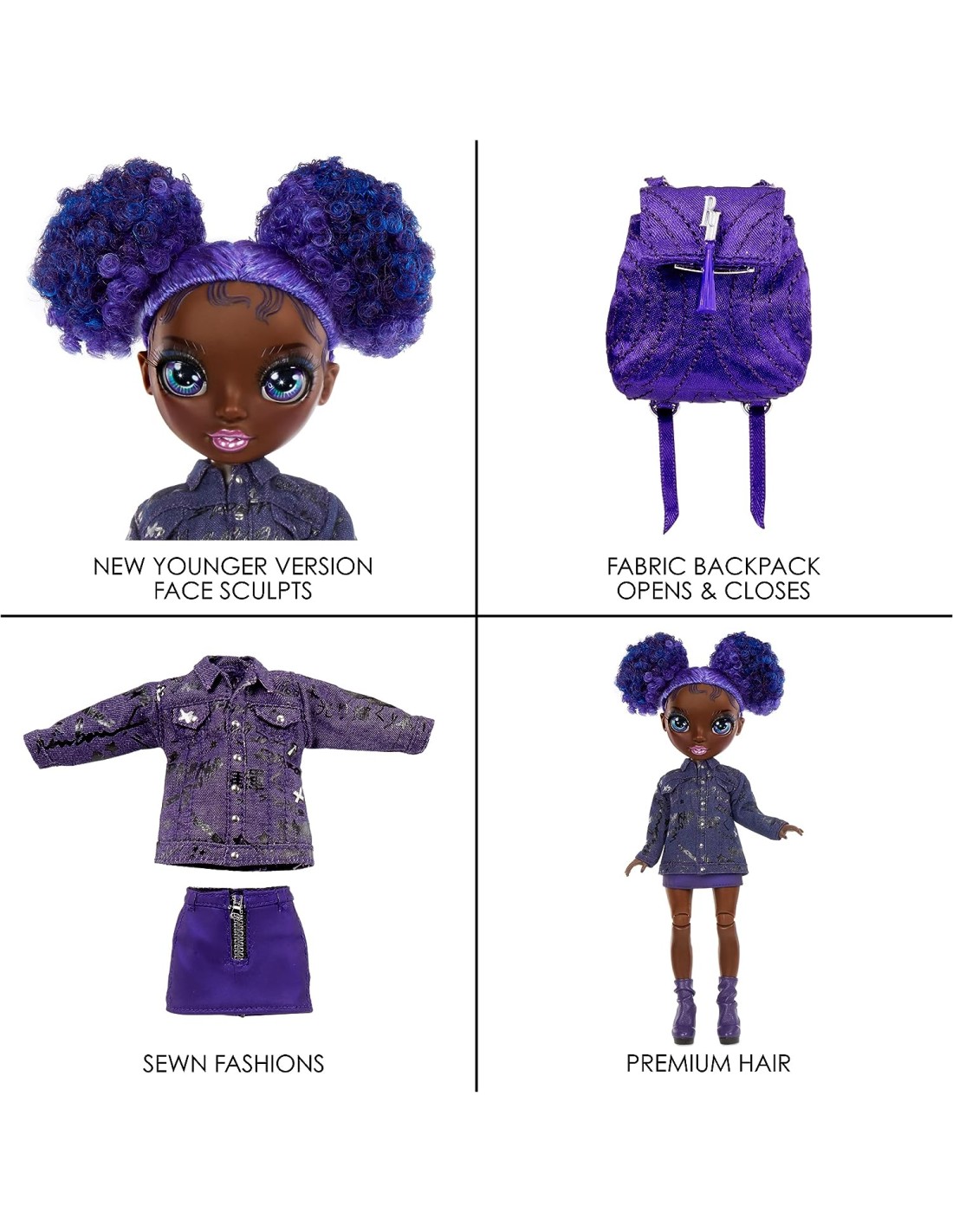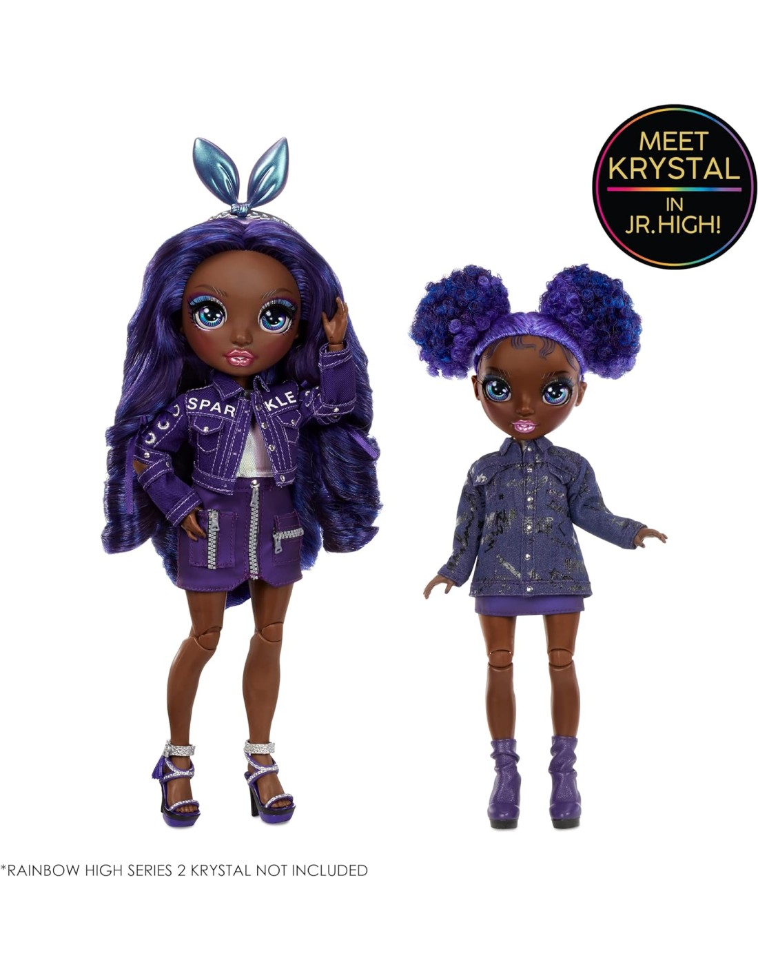 RITORNO A SCUOLA - Rainbow High ispira la creatività! Torna indietro nel tempo e incontra i tuoi studenti preferiti prima che diventino amici e seguano i loro sogni fino alla Rainbow High KRYSTAL - Krystal Bailey viene vestita con il suo caratteristico VIOLA dalla testa ai piedi. Ha splendidi tratti del viso, caratteristiche dettagliate nella sua moda, bei capelli ricci viola in due chignon, ciglia lunghe e occhi scintillanti di vetro STILE - Krystal sogna di essere redattrice capo per una rivista d'arte, quindi ha fatto uno stage presso il suo giornale locale per avere nuovi contatti. Indossa una giacca di jeans con borchie, gonna viola, stivaletti e accessori ACCESSORI - Non esce mai di casa senza il telefono nello zaino. Ha bisogno di un registratore per le sue interviste improvvisate. Il suo zaino in morbido tessuto satinato si apre e si chiude ed è l'accessorio perfetto per tutti i suoi accessori COSA E' INCLUSO - Bambola alla moda da 23 cm, un completo da bambola, un paio di scarpe da bambola, un paio di calzini, fiocco per capelli, pettine per bambole, accessori per bambole e uno zaino in morbido raso che si apre e si chiude METTILA IN POSA - È alta 23 cm ed è completamente articolata e snodabile Le sue braccia e le sue gambe si piegano per tante pose glamour. Puoi mostrarla con la sua versione precedente per una perfetta combinazione da collezione COLLEZIONA L'ARCOBALENO - Colleziona tutte e 6 le bambole della serie 2 della Junior High: Bella Parker, Stella Monroe, Karma Nichols, River Kendall, Krystal Bailey e Amaya Raine Visita il Rainbow High Store per acquistare le incredibili collezioni GUARDA SU YOUTUBE E NETFLIX - Guarda la serie animata su YouTube e Netflix! Basta cercare «Bambole Rainbow High»