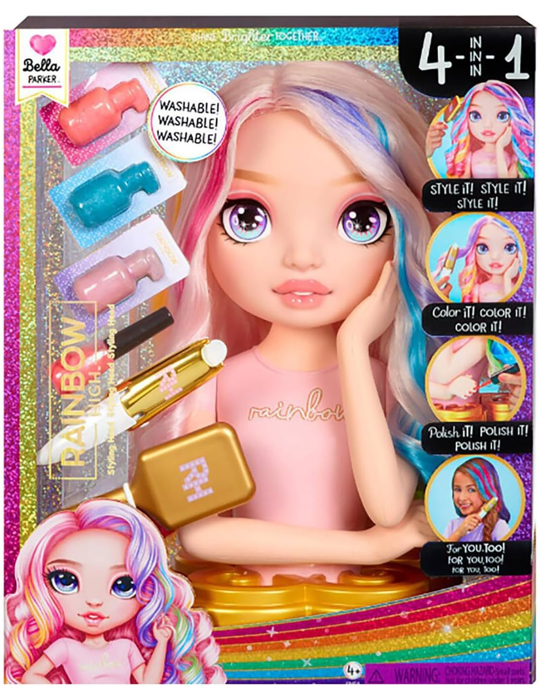 Ti presentiamo il primo set da gioco 4 in 1 Rainbow High Styling Head. Contiene il nostro personaggio più venduto e preferito dai fan, Bella Parker.