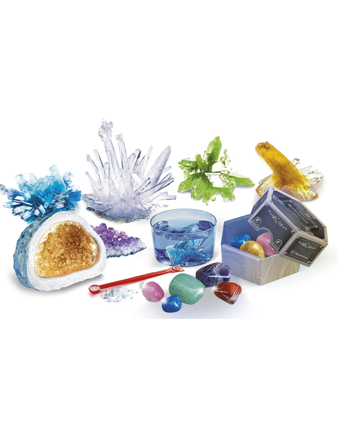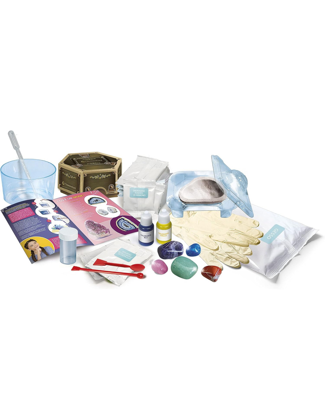 COSA CONTIENE: gioco scientifico Made in Italy adatto per bambini da 8 anni in su, include uno stampo per geode, ingredienti chimici e materiali per la crescita dei cristalli, una collezione di pietre preziose e un manuale scientifico