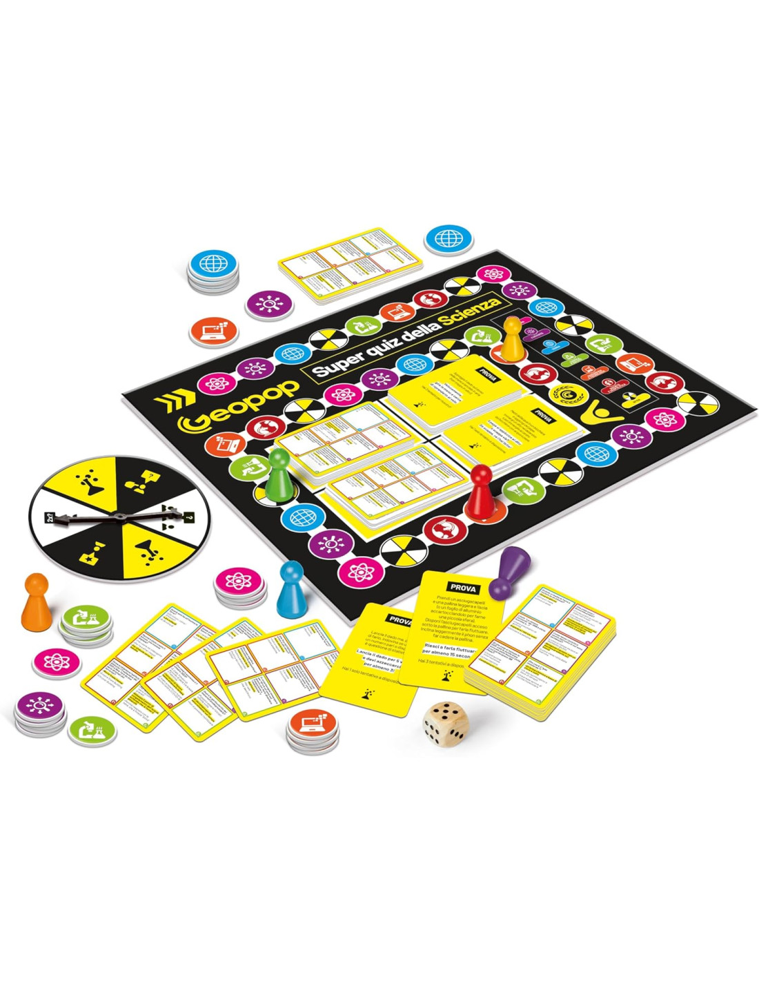 DOMANDA, 12 carte PROVA, 1 spinner, 1 dado, 6 pedine, 36 gettoni e il regolamento di gioco con contenuti ispirati a Geopop