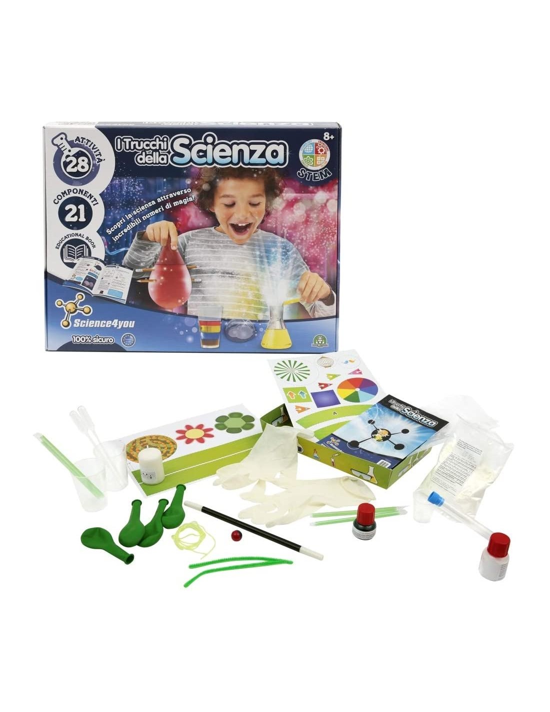 Tanti esperimenti scientificamente magici -28 esperimenti facili, divertenti e sicuri -Per far scoppiare un palloncino senza toccarlo, creare un impasto magico che può essere solido o liquido, riempire un palloncino senza soffiarci dentro -Giochi Educativi Science4You stimolano le tue capacità mentali: abilità motorie, capacità relazionali, creatività , concentrazione e istruzione -Adatto dagli 8 anni in su Tanti esperimenti scientificamente magici 28 esperimenti facili, divertenti e sicuri Per far scoppiare un palloncino senza toccarlo, creare un impasto magico che può essere solido o liquido, riempire un palloncino senza soffiarci dentro.