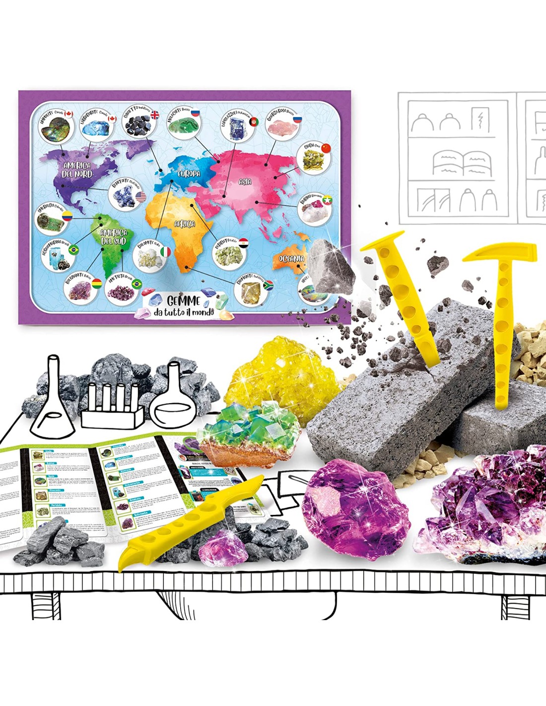 Gioco di sperimentazione scientifica;Blocco da scavare, Minerali, 3 attrezzi da scavo, Poster, istruzioni