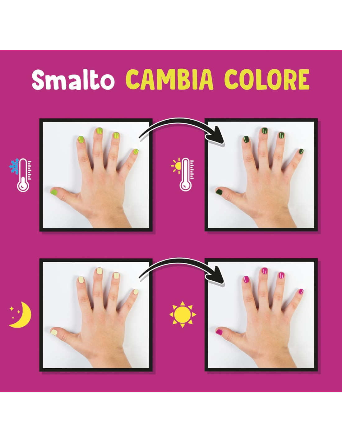 Contenuto: Base smalto, pigmento colorato, glitter, pigmento cambia colore con la luce, pigmento cambia colore con la temperatura, spatolina in legno, pennellino, bottigliette vuote, manuale illustrato