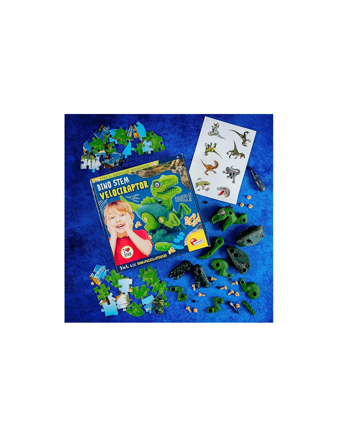 Do it Yourself Dino + Puzzle Diy Dino, facile da costruire, grazie alle ruote sotto le zampe, il dinosauro si muove, con puzzle e stickers Velociraptor in plastica da assemblare, viti in plastica, cacciavite in plastica, puzzle, istruzioni Sperimentazione scientifica, manualità, caratteristiche animali