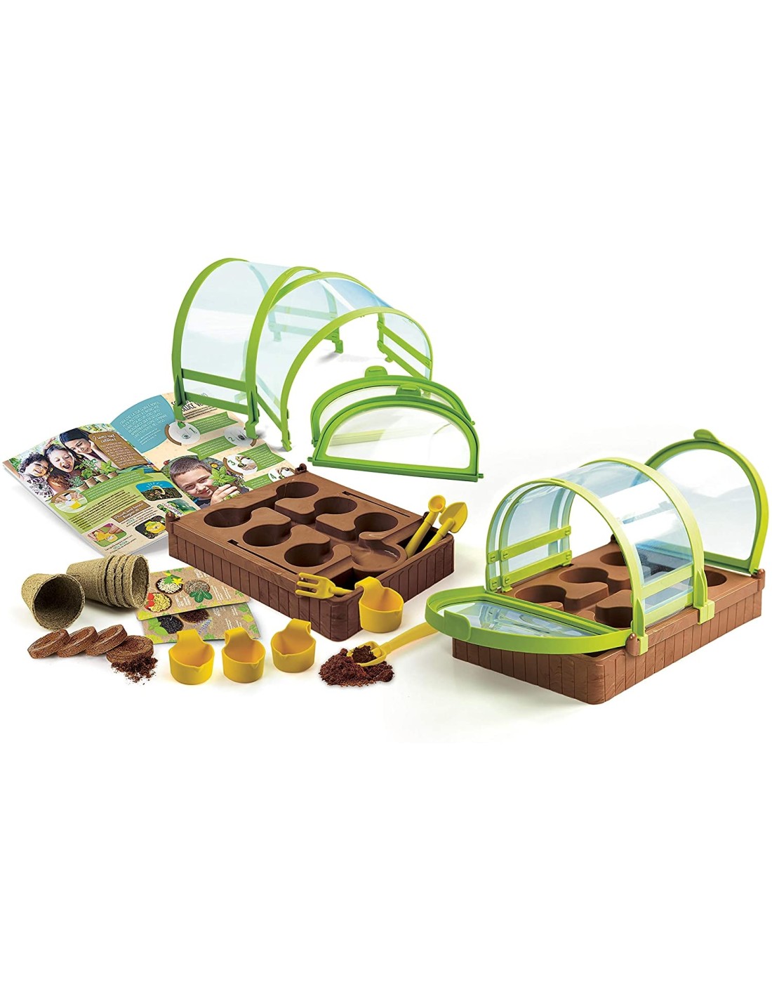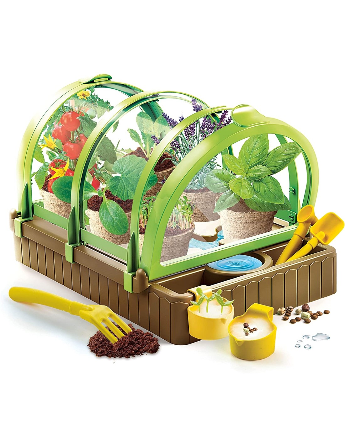 Con un kit completo di strumenti e degli speciali vasetti appendibili per la germinazione che aiuteranno il bambino nella semina e nella coltivazione delle piante!