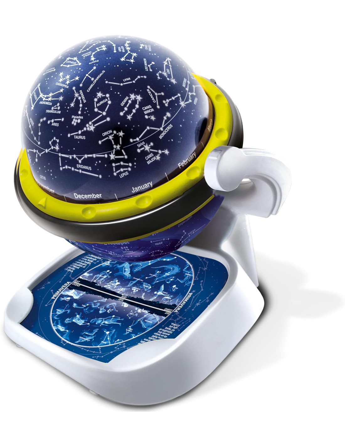 MODALITÀ DI GIOCO: Questo planetario luminoso, da assemblare, rappresenta uno strumento per esplorare il cielo con diverse diapositive e con possibilità di orientare la proiezione, basta ruotare la sfera celeste illuminata per scoprire le stelle dei 2 emisferi.