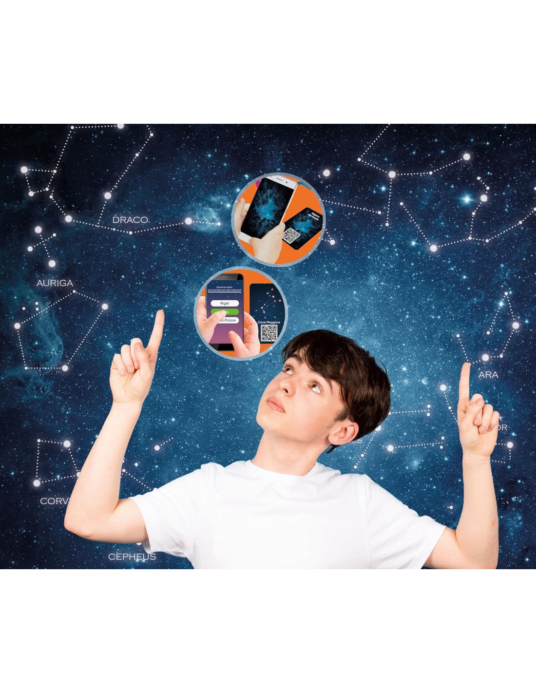 IMPARARE GIOCANDO: un set che include un planetario con diapositive intercambiabili per proiettare diverse immagini dello spazio, integrato con un'app dedicata che offre animazioni 3D, informazioni scientifiche e quiz interattivi