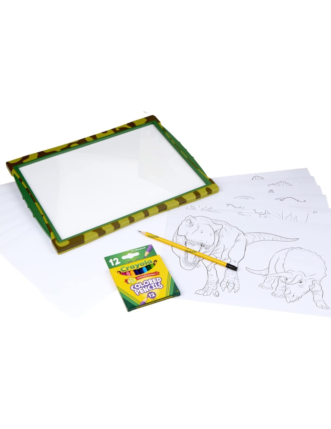 CRAYOLA LIGHT UP TRACIN PAD DINOSAURI: Esplora il mondo preistorico con questa divertente lavagnetta, grazie alla sua superficie luminosa potrai ricalcare le scenette incluse o disegnare liberamente. Contiene 1 matita di grafite, 12 matite colorate corte, 10 fogli da lucido, 10 fogli bianchi e 1 matita di grafite (sono necessarie 3 batterie AA. Vendute separatamente) IL KIT PERFETTO PER GLI ARTISTI IN ERBA: acquista tutta la confidenza di un vero artista, creando scenette sempre perfette! Posiziona uno qualsiasi dei 10 fogli da ricalco sulla lavagnetta, quindi utilizza un foglio bianco e la matita di grafite per tracciare l'immagine prima di completare il disegno aggiungendo il tuo tocco personale PERFETTA OVUNQUE: da portare sempre con te, a casa, in viaggio, o sotto le coperte, il design compatto occupa poco spazio e grazie alla superficie luminosa la puoi usare anche al buio: per quelle sere in cui non vuoi andare a dormire presto! OTTIMA IDEA REGALO: per compleanni, Natale, Pasqua, insomma per tutte le feste questa lavagnetta regalerà ore di divertimento assicurato a tutti i bambini SICURA E NON TOSSICA: consigliata per bambini dai 6 anni in su.