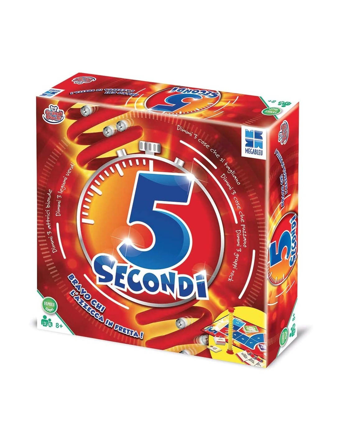 5 secondi è un divertente modo per mettere in mostra la propria preparazione, ma è bene farlo nel minor tempo possibile. Solo 5 secondi appunto per dare tre risposte a domande piuttosto facili, prima che la pallina raggiunga la fine della spiro clessidra. Se le risposte sono corrette, il giocatore avanza nelle caselle e vince chi arriva per primo al traguardo.