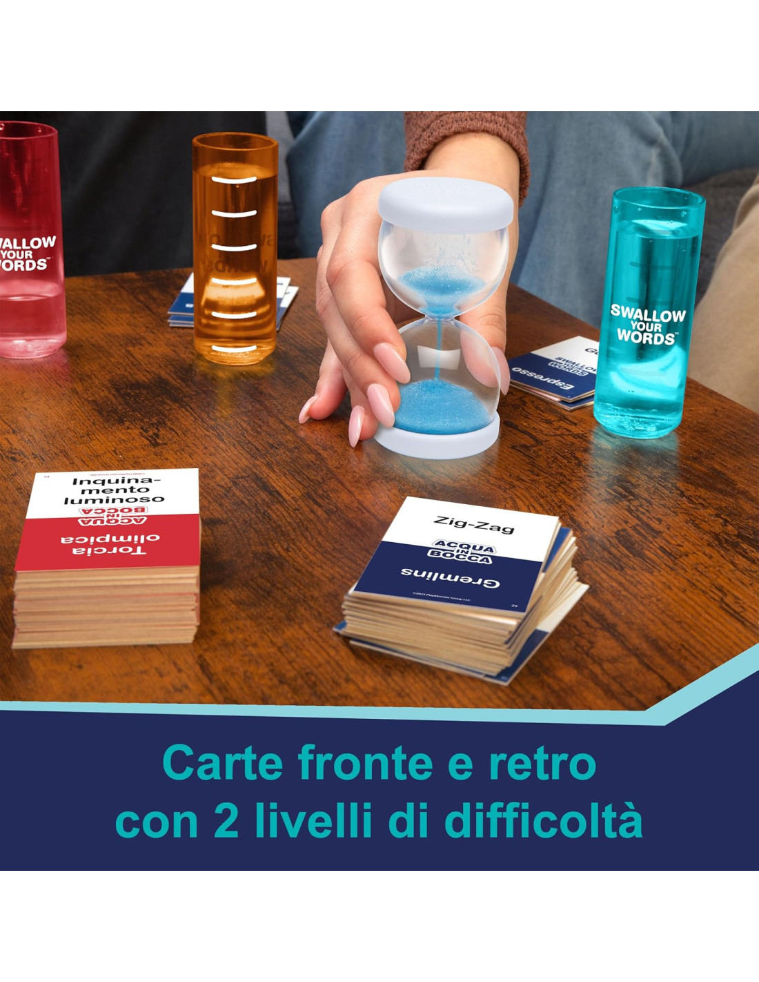 TUTTO INCLUSO PER GIOCARE SUBITO OVUNQUE : La scatola contiene 200 carte (con oltre 800 parole/frasi), 4 bicchieri, 1 clessidra e le istruzioni. Facile da trasportare e rapido da preparare: gioca a casa, in viaggio o alle feste con gli amici.