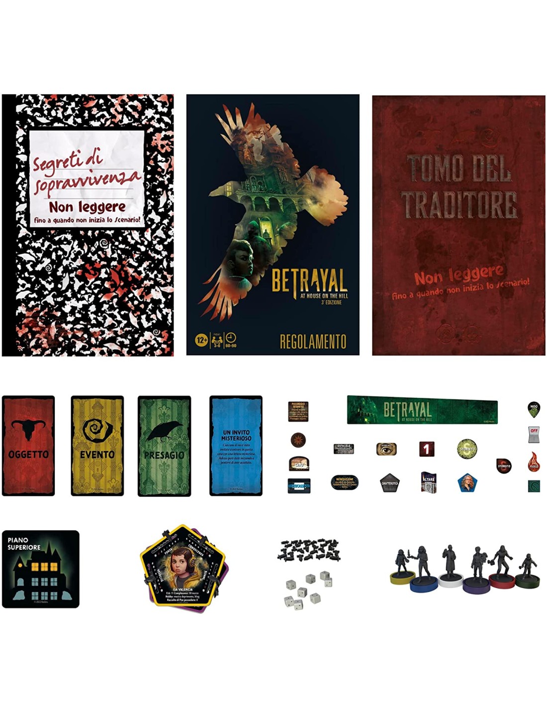 UN'ENTUSIASMANTE TERZA EDIZIONE: un'edizione di Betrayal at House on the Hill ricca di contenuti a tema horror, elementi di gioco e personaggi nuovi rispetto alle precedenti versioni IL GIOCO DEL TRADITORE NELLA CASA INFESTATA: in questo gioco di strategia e cooperativo, i giocatori devono collaborare per sopravvivere all'incubo ma... attenzione! Uno degli esploratori tradirà tutti gli altri! OTTIMO PER I NUOVI GIOCATORI: grafica, manuali di istruzioni, gettoni e carte di questa 3ª edizione sono molto più visual e aiutano i nuovi giocatori a orientarsi immediatamente nel gioco e cominciare subito a divertirsi ELEMENTI DEL TABELLONE MODULARI: Betrayal at House on the Hill presenta 50 Scenari inquietanti, grazie ai quali ciascuna visita alla casa presenta orrori differenti e una nuova storia ogni volta che si gioca MINIATURE DI GIOCO: include 6 pedine personaggio altamente dettagliate, ciascuna con un disco colorato rimovibile e 12 personaggi diversi e nuovi rispetto alle edizioni precedenti