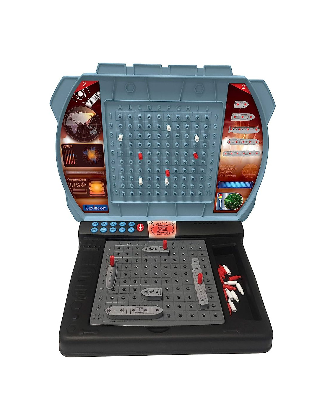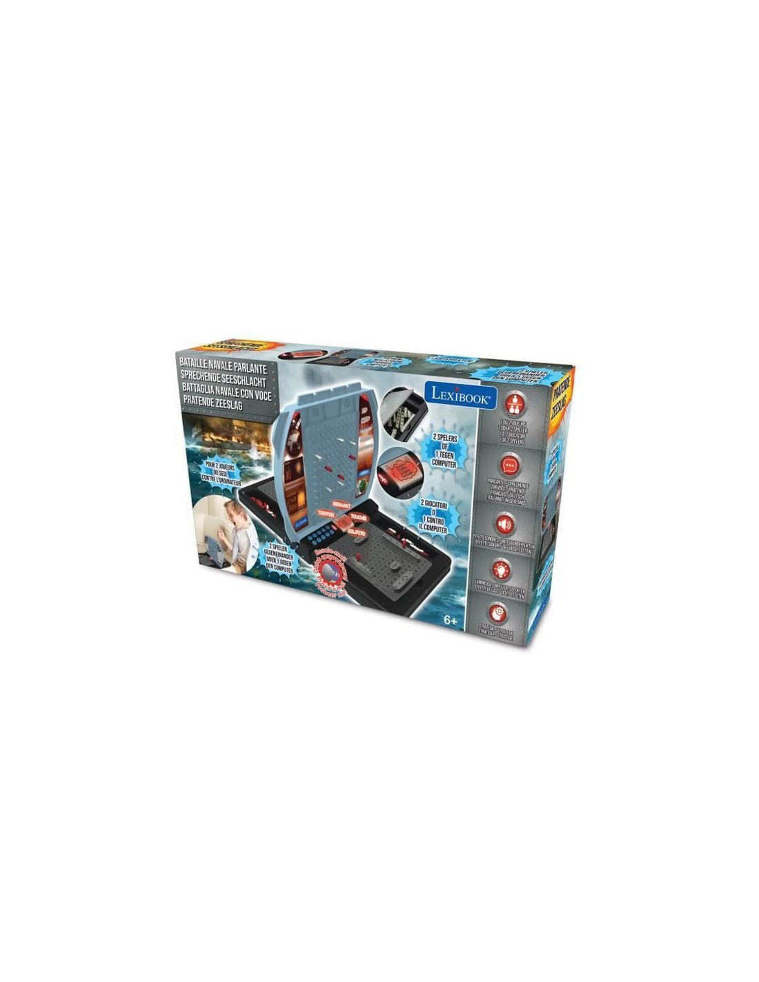 Lexibook- Battaglia Navale con Voce (Francese Italiano Olandese Tedesco), Gioco da Tavolo 1 o 2 Giocatori, interattiva, Effetti sonori, strategia, Alimentato a Batteria, Grigio/Nero, Colore