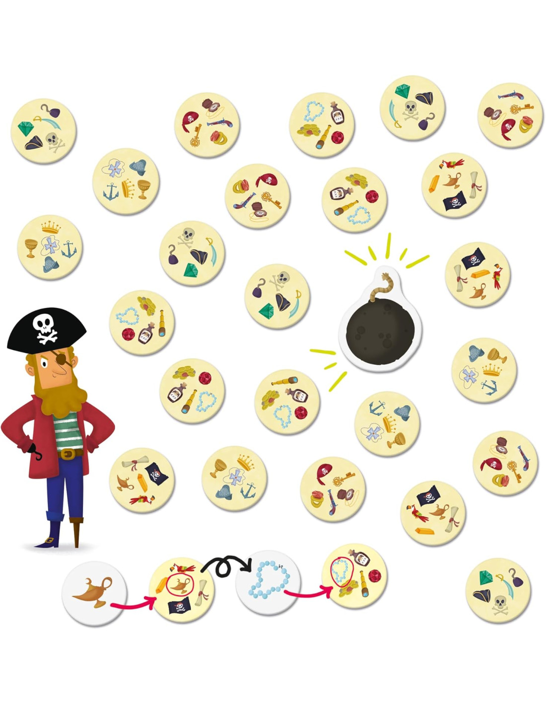 AGUZZA LA VISTA: Raccogli il maggior numero di gettoni del tesoro prima che il gettone bomba esploda, per diventare il pirata più ricco!