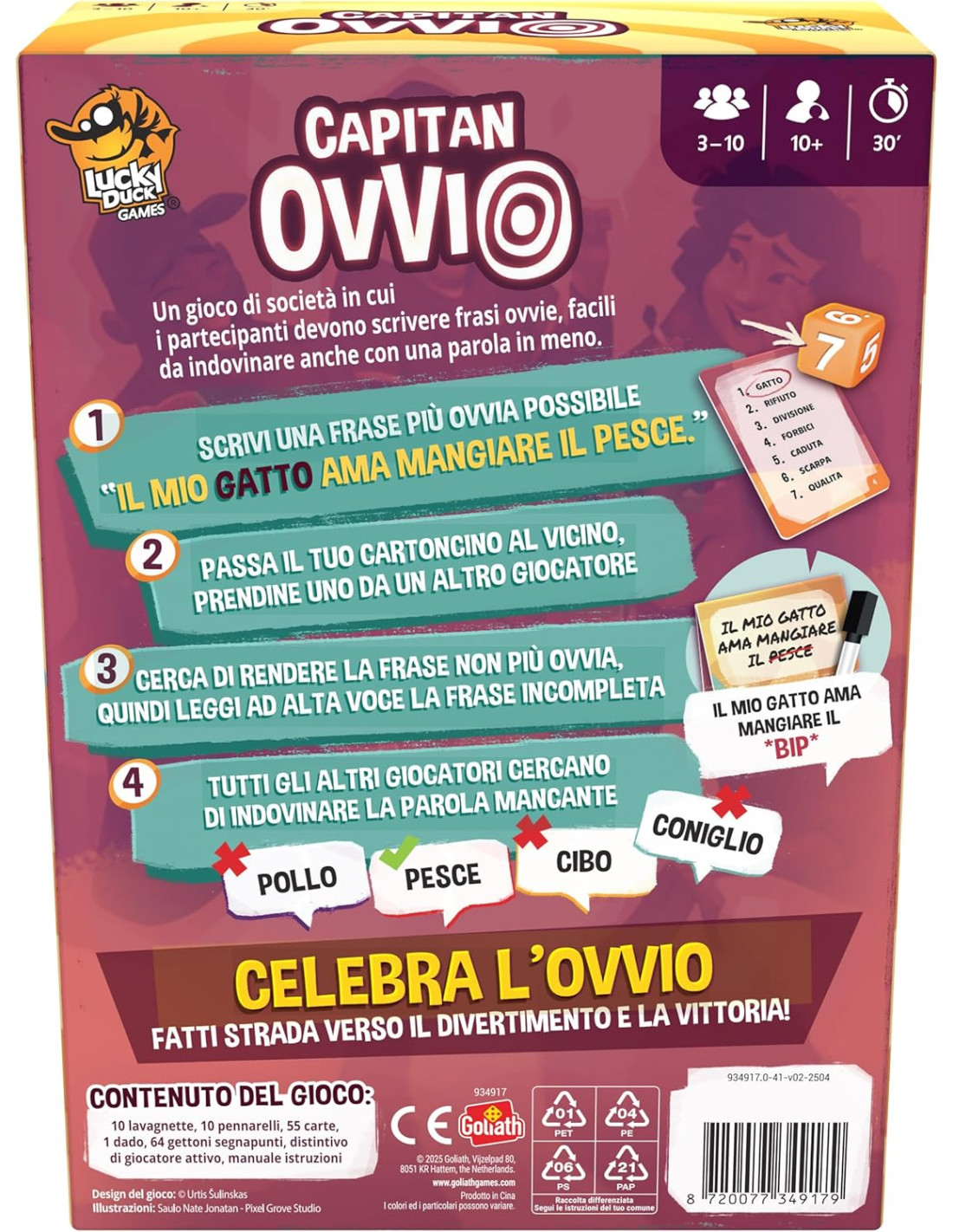 GIOCO DI PAROLE & INDOVINELLI - IL CONCETTO: In Capitan Ovvio fai punti scrivendo frasi così ovvie che, anche se una parola viene cancellata, tutti capiscono comunque. Si parte da un termine comune, si scrive una frase, si passa la lavagnetta al vicino, lui cancella un vocabolo e gli altri indovinano. Ritmo veloce, risate e battute: perfetto come party game da serata.