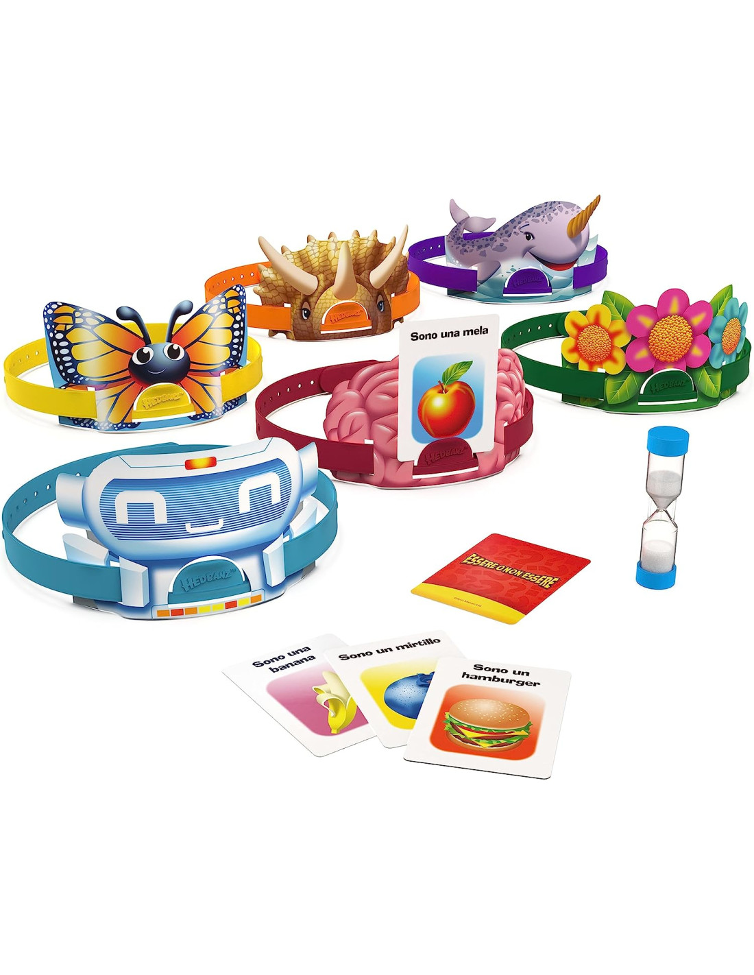 Lo scopo del gioco è quello di indovinare il soggetto raffigurato sulla carta posta sulla propria fronte nel minor tempo possibile. Ideale per passare una serata in allegria tra amici o in famiglia. La confezione contiene 6 fascette inplastica personalizzate, 69 carte + carte esempio domande, 1 clessidra, 24 gettoni, 1 istruzioni.