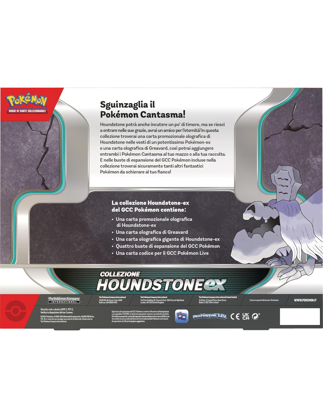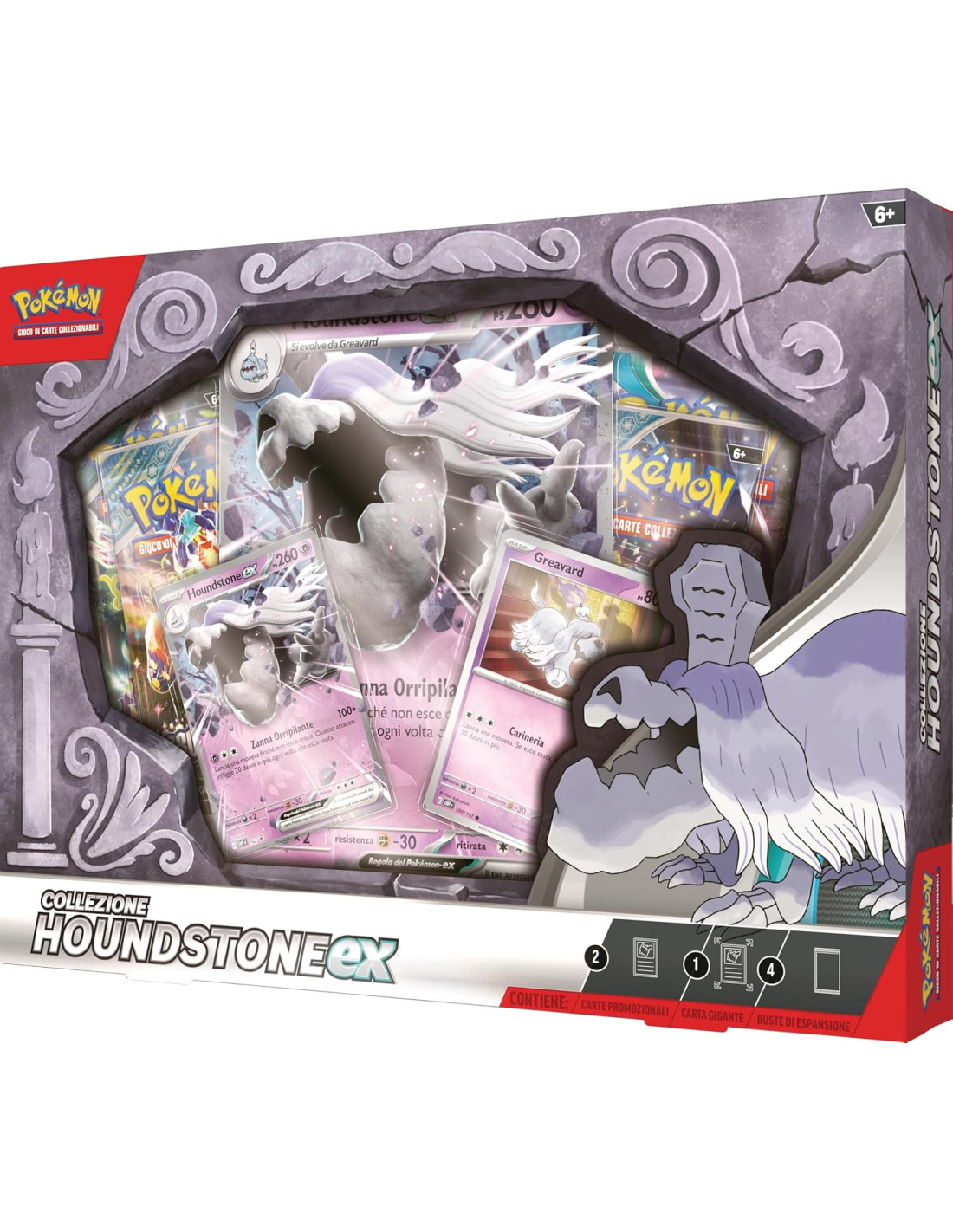 Contenuto: una carta promozionale olografica di Houndstone-ex, una carta olografica di Greavard, una carta olografica gigante di Houndstone-ex, quattro buste di espansione del GCC Pokémon, una carta codice per il GCC pokémon live