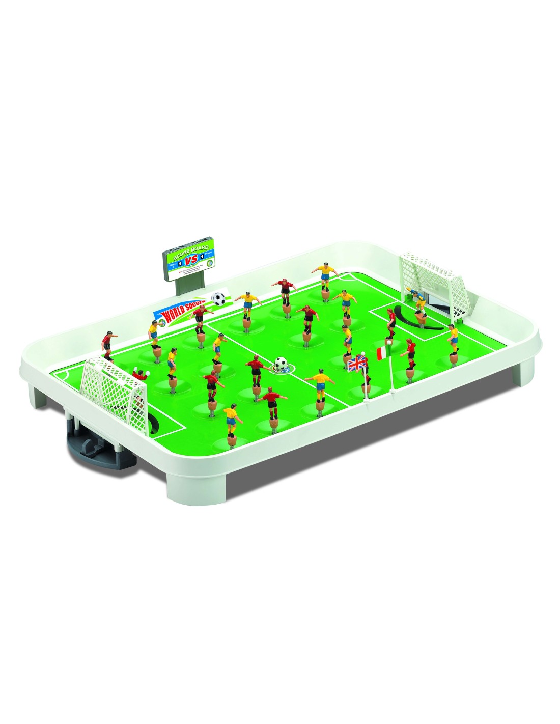 Base da tavolo per un'avvincente partita di calcio. Include 2 squadre da 11 giocatori, una palla, 2 bandierine e 1 cartellone segna punti. I 2 portieri si spostano grazie a una levetta posta dietro le 2 porte mentre i giocatori si muovono spingendoli avanti e indietro manualmente. Num. Giocatori: 2+