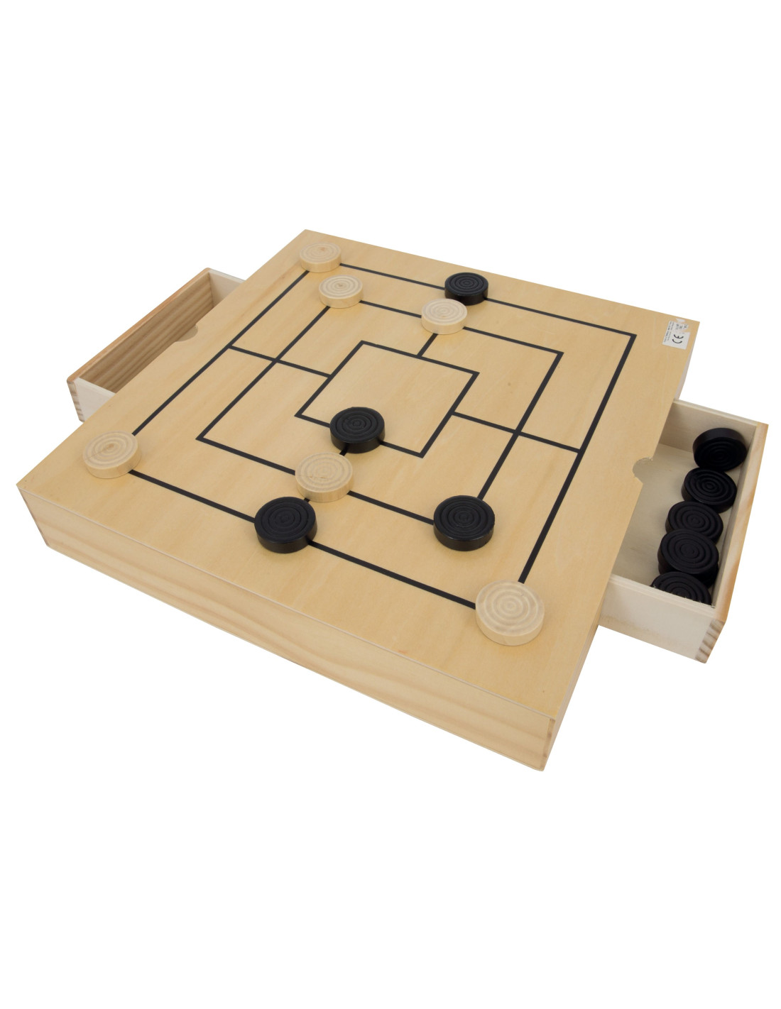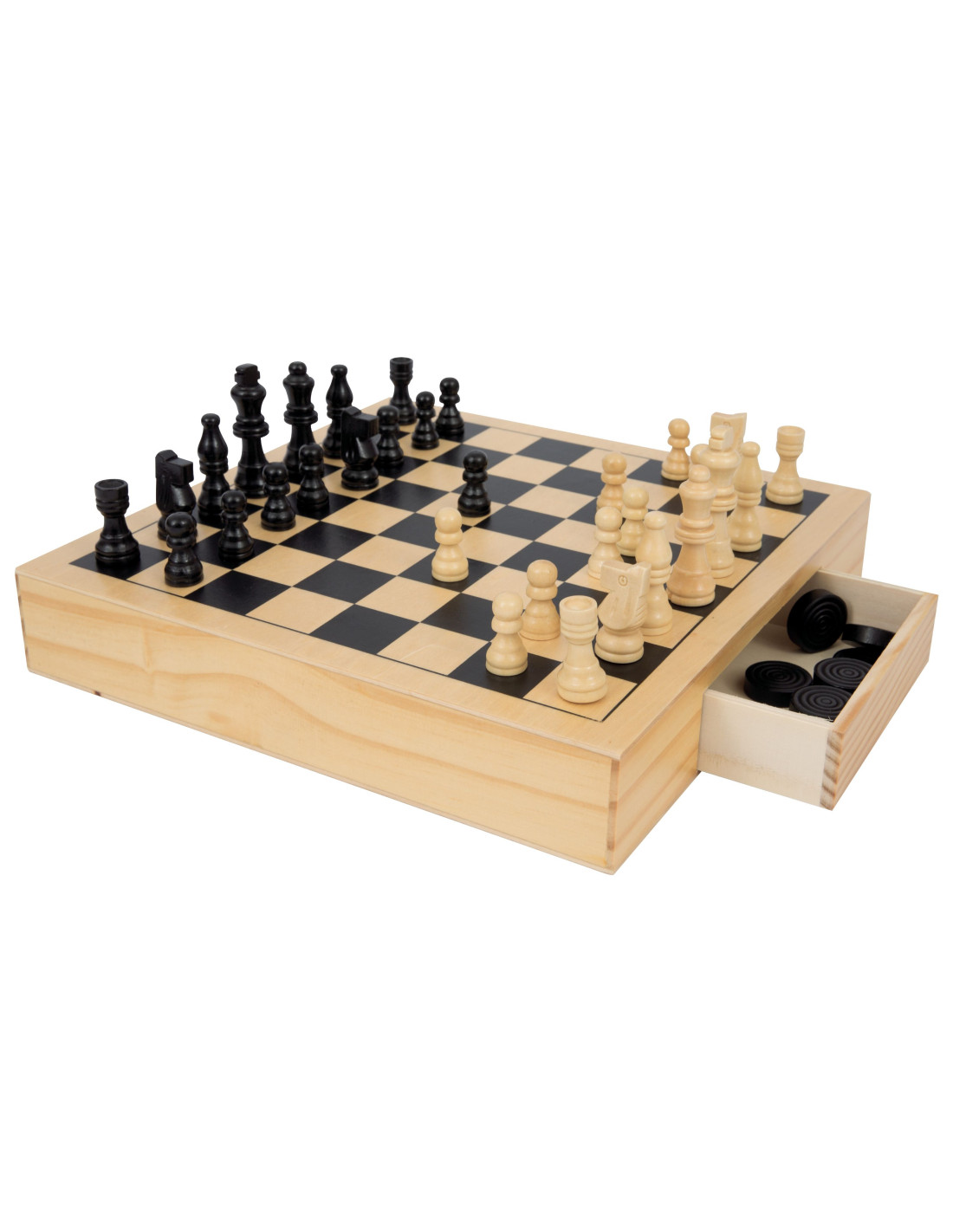 Una base di gioco in legno per 3 grandi classici dei giochi da tavolo: Dama, Scacchi e Tria. La confezione include: 1 base di gioco double-face con 2 cassetti, 32 scacchi, 24 pedine e le istruzioni di gioco.
