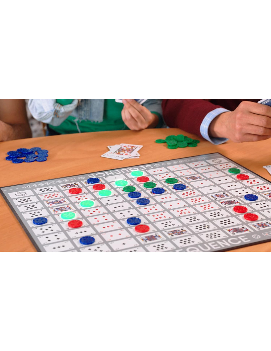 Sequence è un divertente gioco da tavolo per 2 giocatori e oltre, ma può essere giocato anche in squadre fino a 12 persone. Con i suoi elementi strategici, il gioco è simile al poker. Anche il bluff e il gioco strategico fanno parte di questo gioco. Immaginatevi a Las Vegas e divertitevi a giocare a carte! È un gioco di carte strategico facile da imparare, con carte e fiches. Questo party game offre una combinazione ideale di fortuna e strategia, che permette di stare all'erta anche quando si gioca contro gli avversari. Sono già state vendute più di 10 milioni di copie in tutto il mondo. Un must per l'armadio dei giochi, quindi! Sequence Original è adatto a gruppi piccoli e grandi. Il gioco da tavolo può essere giocato da 2 a 12 giocatori contemporaneamente, a seconda che si giochi da soli o in squadre. Il gioco è adatto a bambini dai 7 anni in su. Sequence contiene 1 tabellone, 104 carte Sequence, 50 gettoni blu, 50 gettoni verdi, 35 gettoni rossi e le istruzioni del gioco.
