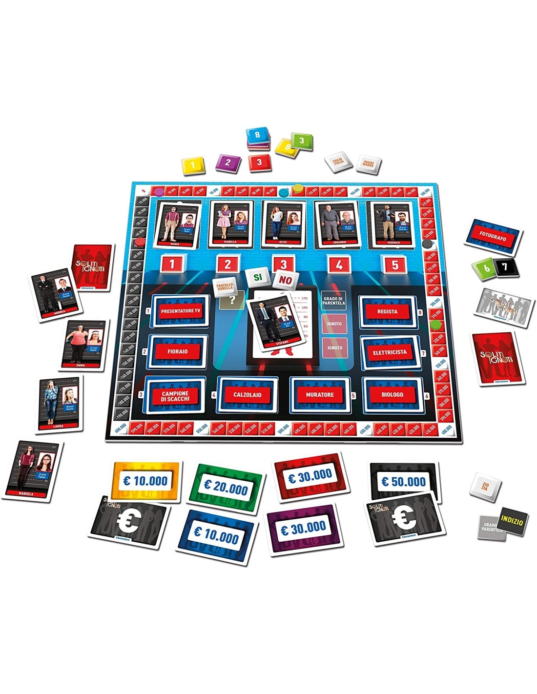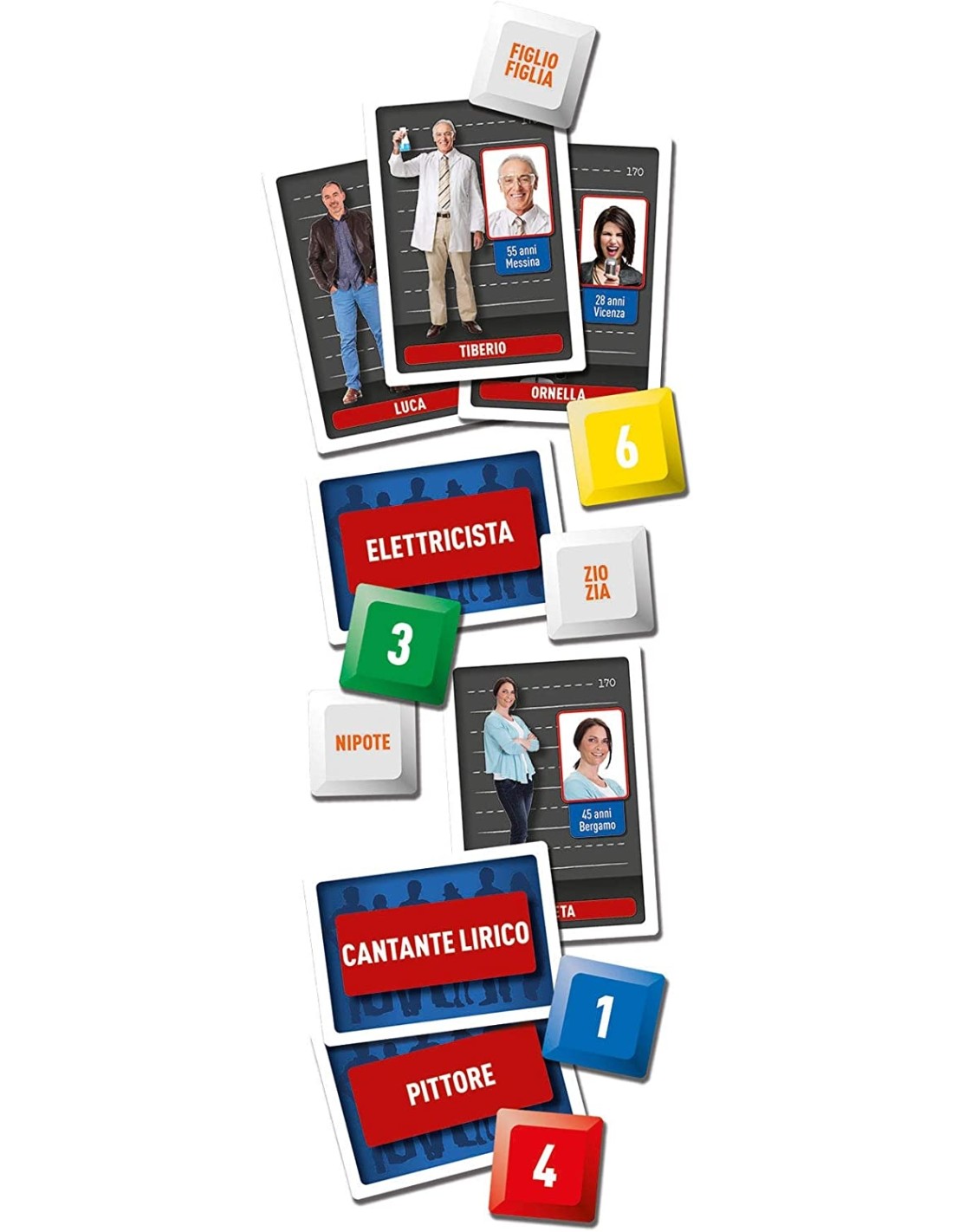 Contiene un tabellone con identità nascoste e carte "mestiere" da abbinare a ciascuna di queste... chi sarà il più bravo a svelarle tutte e vincere?