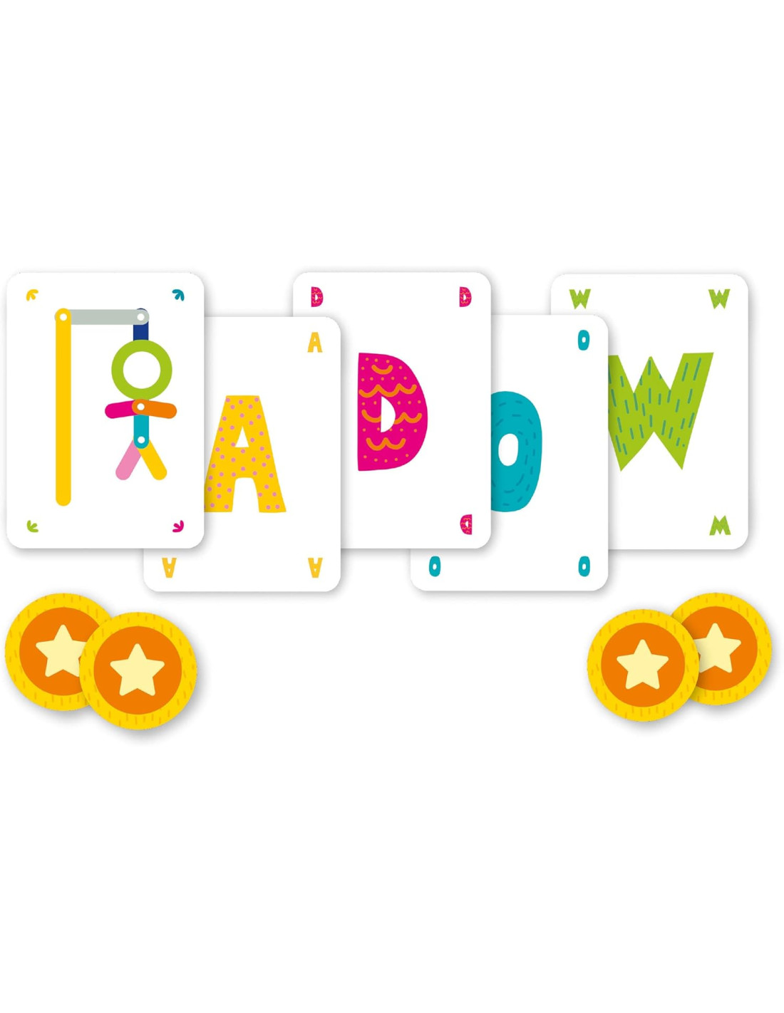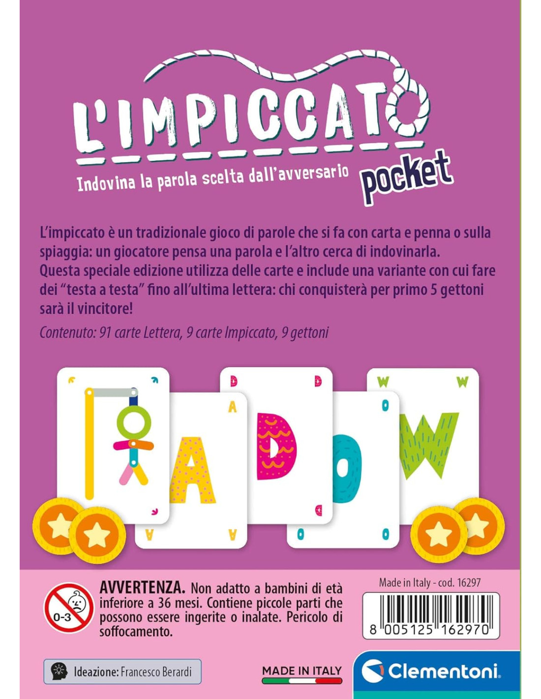 COSA CONTIENE: 91 carte lettera, 9 carte impiccato e 9 gettoni