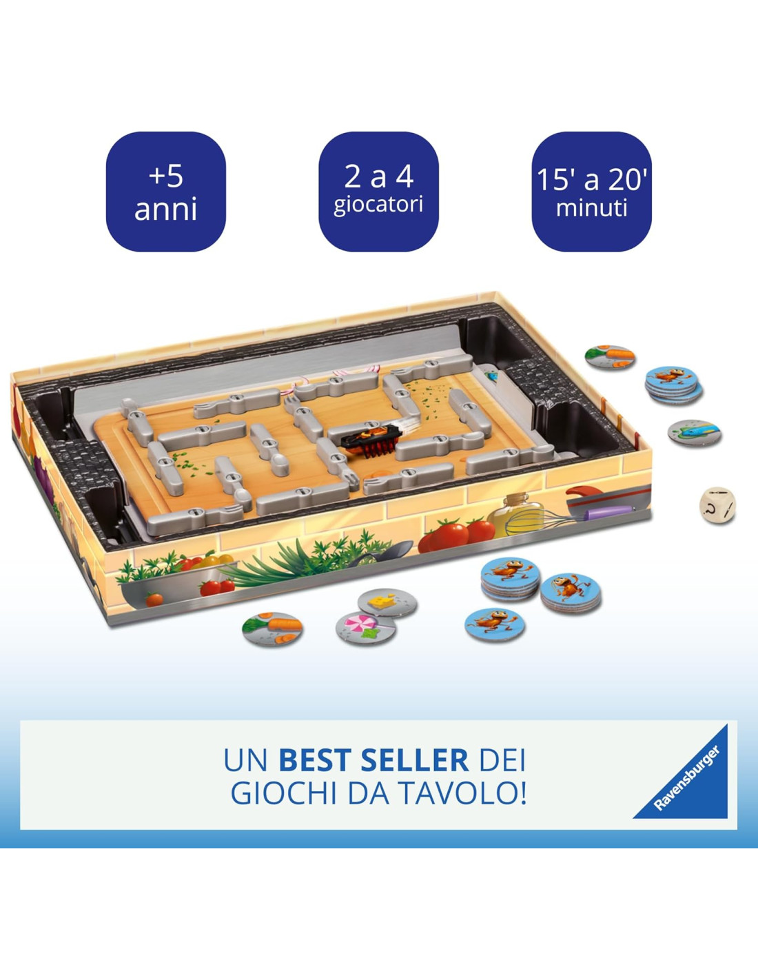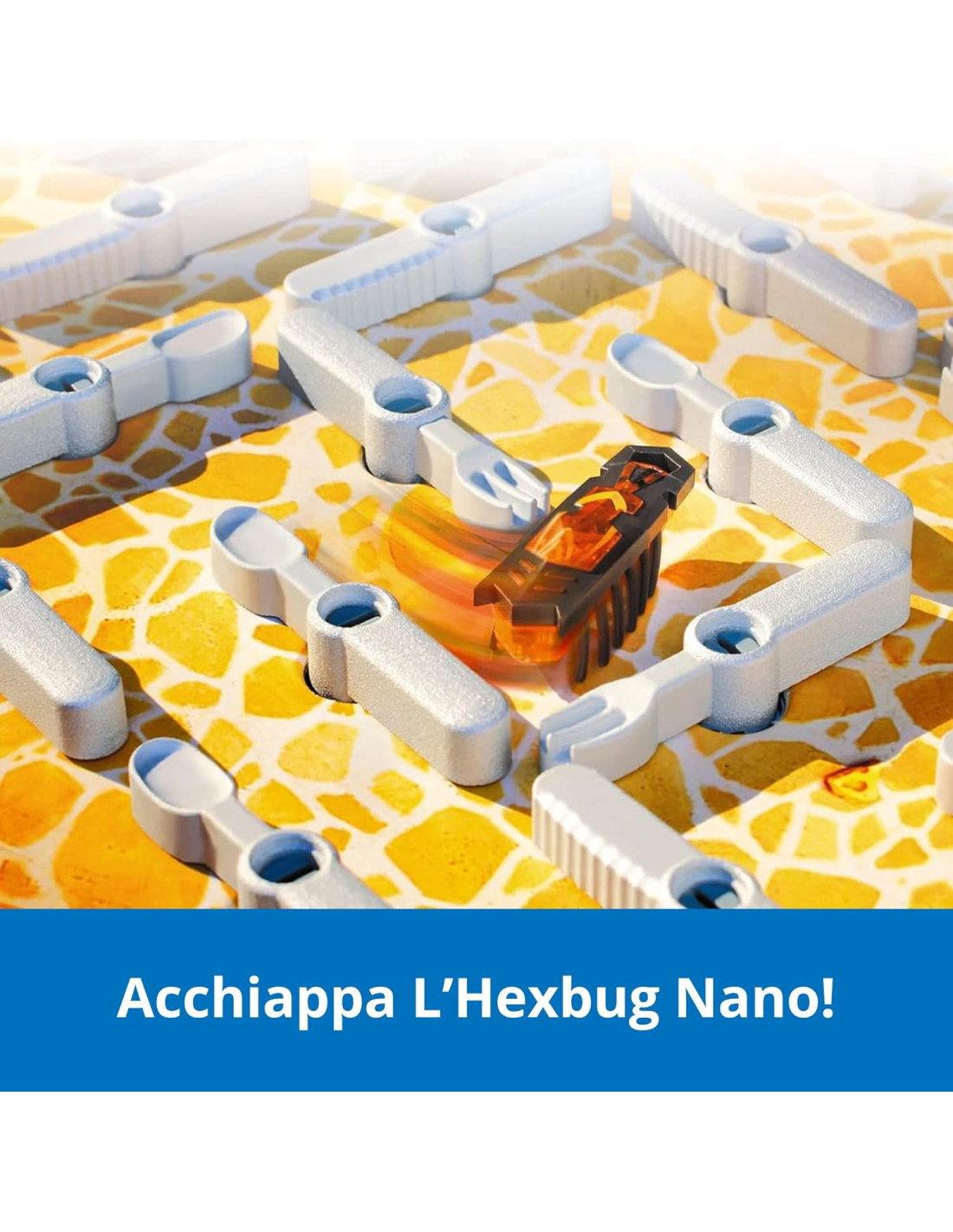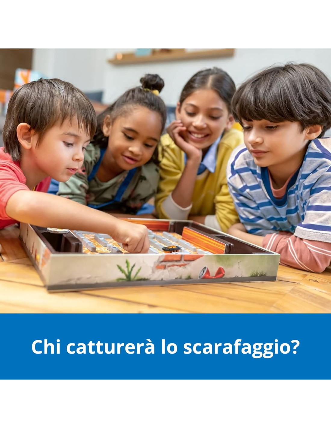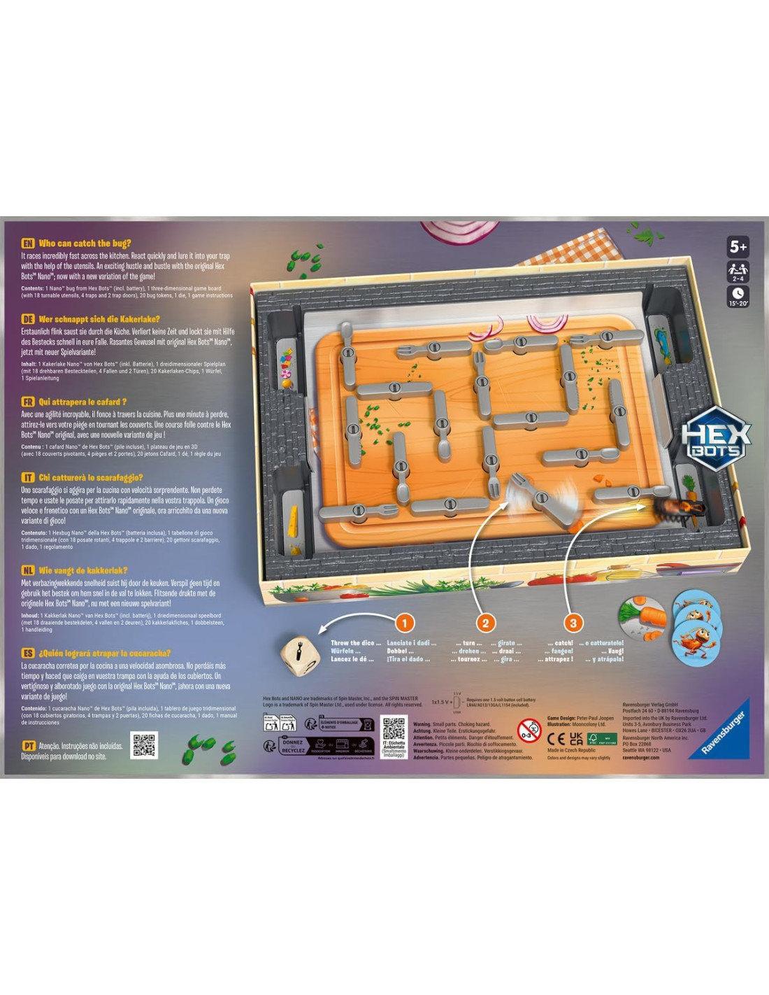 Gli scarafaggi sono a piede libero: il popolare gioco di reazione per bambini e adulti. I giocatori girano abilmente l'argenteria e cercano di attirare lo scarafaggio nella trappola Varietà garantita grazie all'agile HEXBUG nano: lo scarafaggio è imprevedibile e sceglie un percorso diverso ad ogni partita Le regole sono semplicissime e la rapida configurazione del gioco ti permettono di iniziare subito a giocare. La breve durata di 15-20 minuti rende questo gioco d'azione un bel passatempo che offre molto divertimento. Il gioco La Cucaracha per 2-4 giocatori è un successo ad ogni festa di compleanno per bambini e una piacevole sorpresa come regalo! Ora con un nuovo design e con una variante di gioco aggiuntiva.